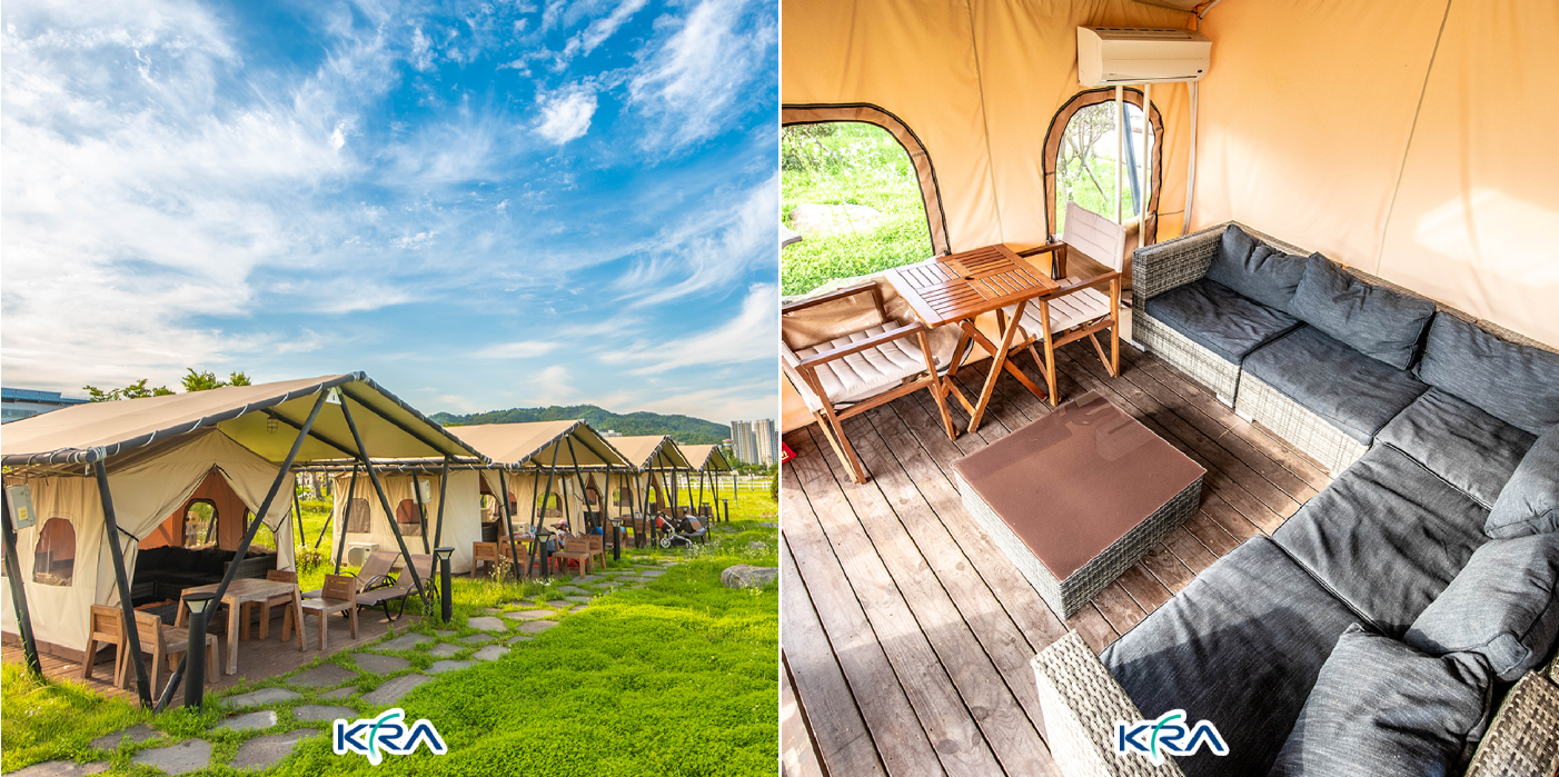 가을은 캠핑을 좋아하는 사람들에게 가장 설레는 계절이 아닐까 생각됩니다. 자연에 둘러싸인 렛츠런파크 서울 한편에는 글램핑장이 잘 마련되어 있는데요. 아늑한 텐트와 광활하게 펼쳐진 공원 전경은 그야말로 천고마비, 하늘은 높고 말은 살찌는 계절인 가을을 한껏 느낄 수 있는 공간입니다.