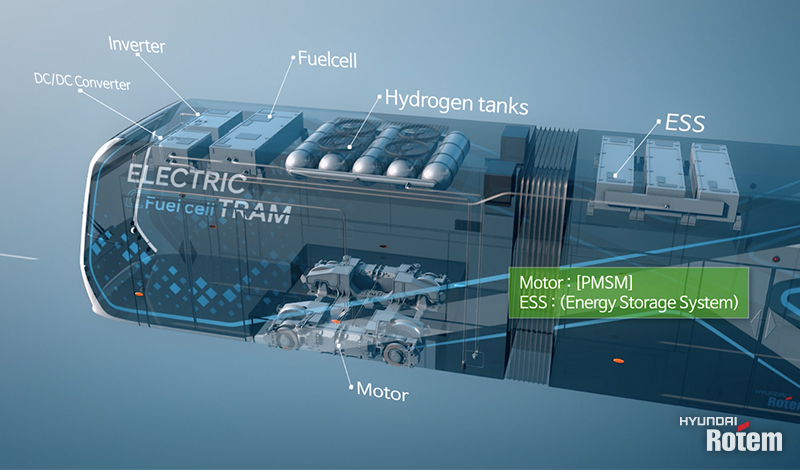 수소전기트램은 설계최고속도 70km/h, 1회 충전 시 최대 150km 주행이 목표이며 현대로템은 대용량 수소 적재를 위한 철도차량용 수소저장 탱크 모듈 등 관련 부품과 시스템을 함께 개발하고 있습니다.