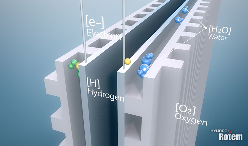 이번에는 수소전기트램에 전력을 공급하는 수소연료전지 기술을 조금 더 자세히 살펴보겠습니다. 수소연료전지에는 물을 전기분해했을 때 수소와 산소가 발생하는 원리가 이용됩니다. 전기 대신 수소를 충전하고 화학반응을 통해 발생한 전기로 움직이는 것이죠.