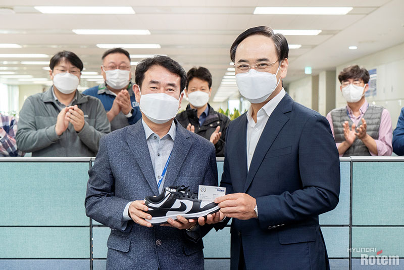 시상은 현대로템 이용배 대표이사가 직접 정광무 팀장의 업무 사무실에 방문하여 상장과 더불어 시상품을 전달했습니다. 덕분에 수상자뿐만 아니라 투표에 참여했을 팀원들이 모두 함께 기쁨을 나눌 수 있었습니다.