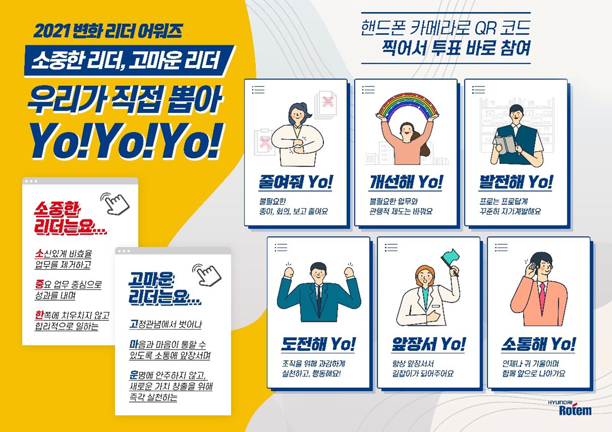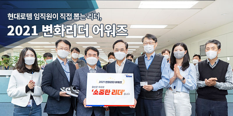 조직에서 리더의 영향력은 구성원이 일하기 좋은 여건을 마련할 뿐만 아니라 회사 전체 조직문화 발전의 원동력이 됩니다. 현대로템은 이러한 긍정의 리더십이 전사적으로 확대 및 전파될 수 있도록 다양한 조직문화 개선활동을 지속적으로 추진해 나갈 예정인데요. 내년에도 변화 마인드 고취를 위한 변화리더 어워즈를 지속 시행할 계획입니다. 앞으로도 함께 성장하는 기업문화를 만들어갈 현대로템의 행보에 많은 관심으로 지켜봐 주세요!