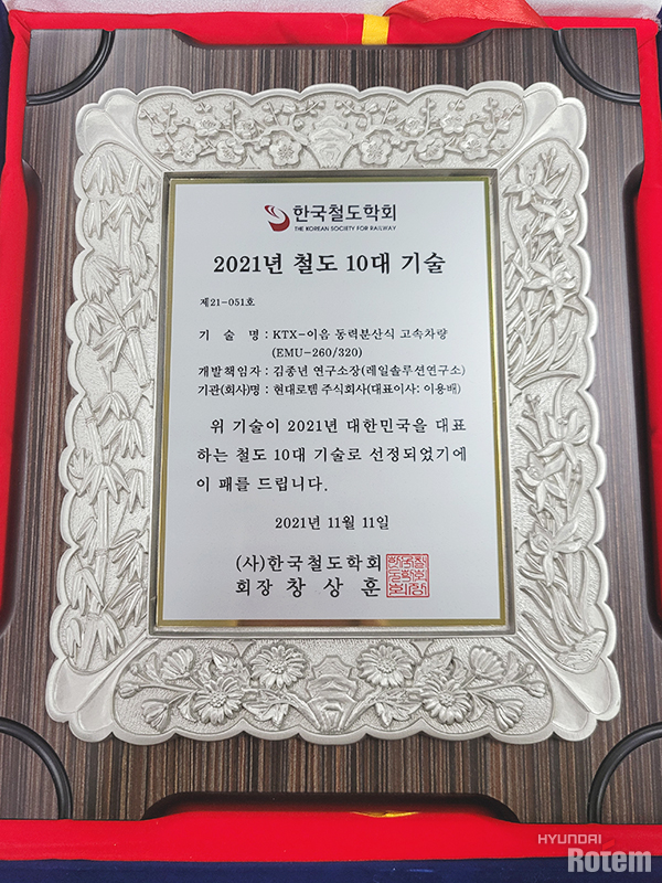 한국철도학회는 지난 2015년부터 매년 국내에서 개발된 철도 분야(차량기계, 전기신호, 궤도토목, 정책운영 등)의 우수한 기술과 제품을 발굴해 표창하는 철도 10대 기술상을 운영하고 있습니다. 철도 10대 기술상을 수상했다는 것은 철도 분야의 여러 기술 중에서도 사회, 경제적으로 큰 영향력을 발휘했다는 의미죠.