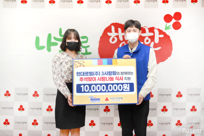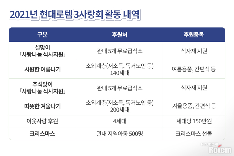 이웃과 더불어 사는 상생의 기업이 되기 위해 현대로템과 3사랑회는 내년에도 따뜻한 행보를 이어가겠습니다. 현대로템이 그리는 상생의 가치 실현에 많은 관심 부탁드리며, 이웃에게 따스함을 전하는 3사랑회에 현대로템 임직원분들의 적극적인 참여 부탁드리겠습니다!
