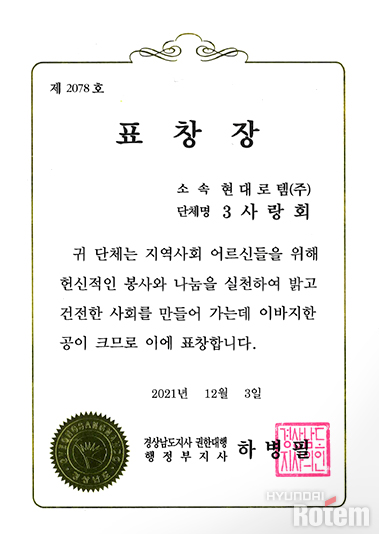 현대로템 3사랑회의 활동으로 많은 이웃들이 올해도 따뜻한 한 해를 보낼 수 있었는데요. 이러한 지역사회 복지에 기여한 공을 인정받아 3사랑회는 지난 12월 3일, 사회공헌 우수 단체로 ‘경상남도지사 표창장’을 수상했습니다. 앞으로도 3사랑회는 우리 이웃에게 지속적으로 경제적, 정서적 지원을 이어감으로써 기업과 사회가 함께 공존할 수 있도록 노력할 예정입니다.