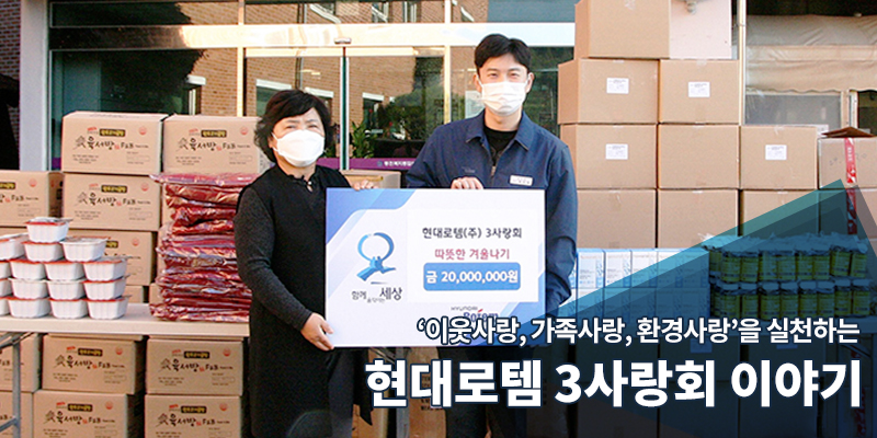 20년간 사회공헌활동을 이어온 현대로템 3사랑회는 올해에도 이웃에게 따스함을 전하는 활동을 이어갔습니다. 가장 최근에는 코로나19 장기화로 돌봄 사각지대에 놓인 저소득 가정, 독거노인 등 소외이웃 200세대에 2천 만원 상당의 동절기 생활용품인 목도리, 의류, 즉석국 등을 지원했는데요. 현대로템 3사랑회의 성금을 기탁받은 경남사회복지공동모금회 관계자는 “도움이 절실한 소외 이웃들에게 도움과 희망을 나누어준 현대로템 3사랑회에 감사하다”며 인사를 전하기도 했습니다.