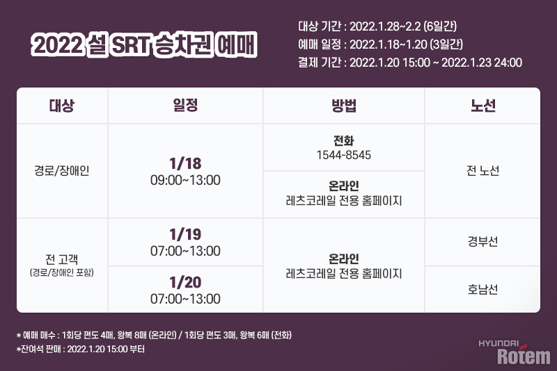 2022년 임인년의 새해가 밝았습니다. 이미 많은 분이 1월 말~2월 초에 걸쳐 있는 설날 준비를 시작하셨을 텐데요. 그중에서도 가장 중요한 설날 기차표 예매가 곧 시작됩니다. 이번 설날도 100% 비대면으로 예매가 진행되는데요. KTX와 SRT, 노선별로 다른 예매 방법을 현대로템 블로그에서 소개해 드립니다.