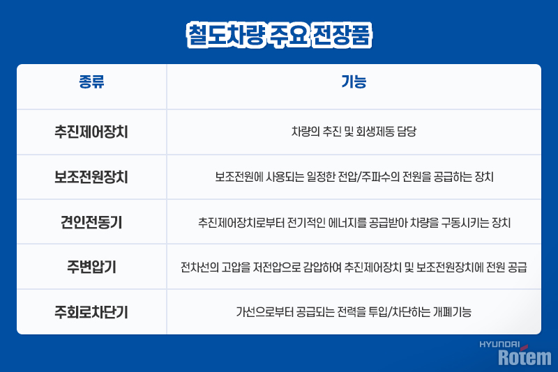 철도차량은 운행 환경과 용도, 특성에 따라 고속철도, 전동차, 경전철, 트램 등 다양하게 분류되며 요구되는 차량 구성 및 중량, 감가속도, 최고운영속도도 상이합니다. 이에 전장품 역시 필요 사양에 최적화된 설계를 통해 차량마다 다르게 적용되는데요. 오늘 현대로템 알쓸신철에서는 철도차량의 운행과 직결되는 핵심 장치인 전장품에 대해 알아보겠습니다.
