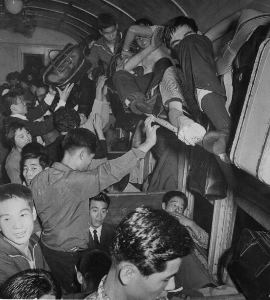 매표창구가 24개나 되는 서울역 앞도 상황은 마찬가지였습니다. 꼭두새벽부터 나와 고향으로 향할 열차표를 사기 위해 사람들은 줄을 섰죠. 서울역 앞 인파는 5천 명까지 몰리기도 하며, 용산 방향으로 200m나 줄이 이어지기도 했습니다. 표를 구하지 못한 사람들에게 웃돈을 주고 암표를 팔기도 하고, 객차 안에 자리가 없어 짐을 올려놓는 선반에 누워서 이동하기도 했는데요. 사진만 봐도 그 시절 귀성길 전쟁이 대단했다는 점이 느껴지지 않나요?