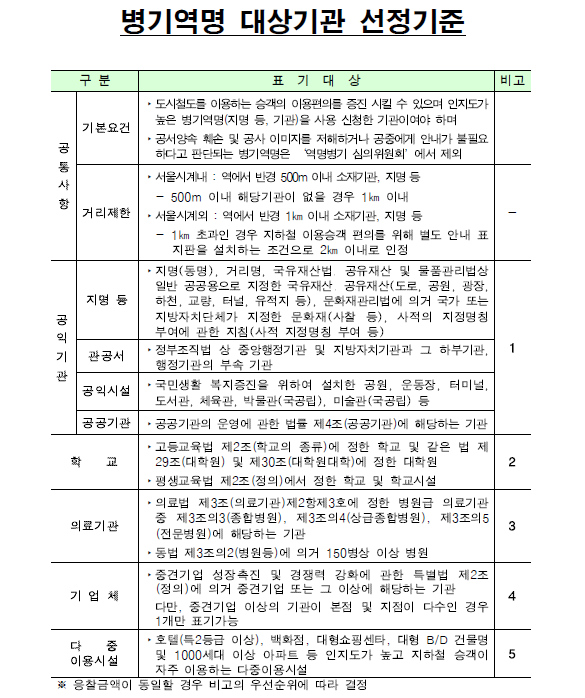 또한, 이용 승객의 편의를 증진시킬 수 있도록 인지도 높은 병기역명이 기본 요건이 되며 역에서 반경 1km 이내에 위치한 소재기관 및 지명으로 거리 제한을 두고 있습니다. 그리고 응찰금액이 동일한 경우에는 공익기관, 학교, 의료기관, 기업체, 다중이용시설 순으로 우선순위를 적용시키는 등 최대한 공공성을 지키기 위해 노력하고 있습니다.