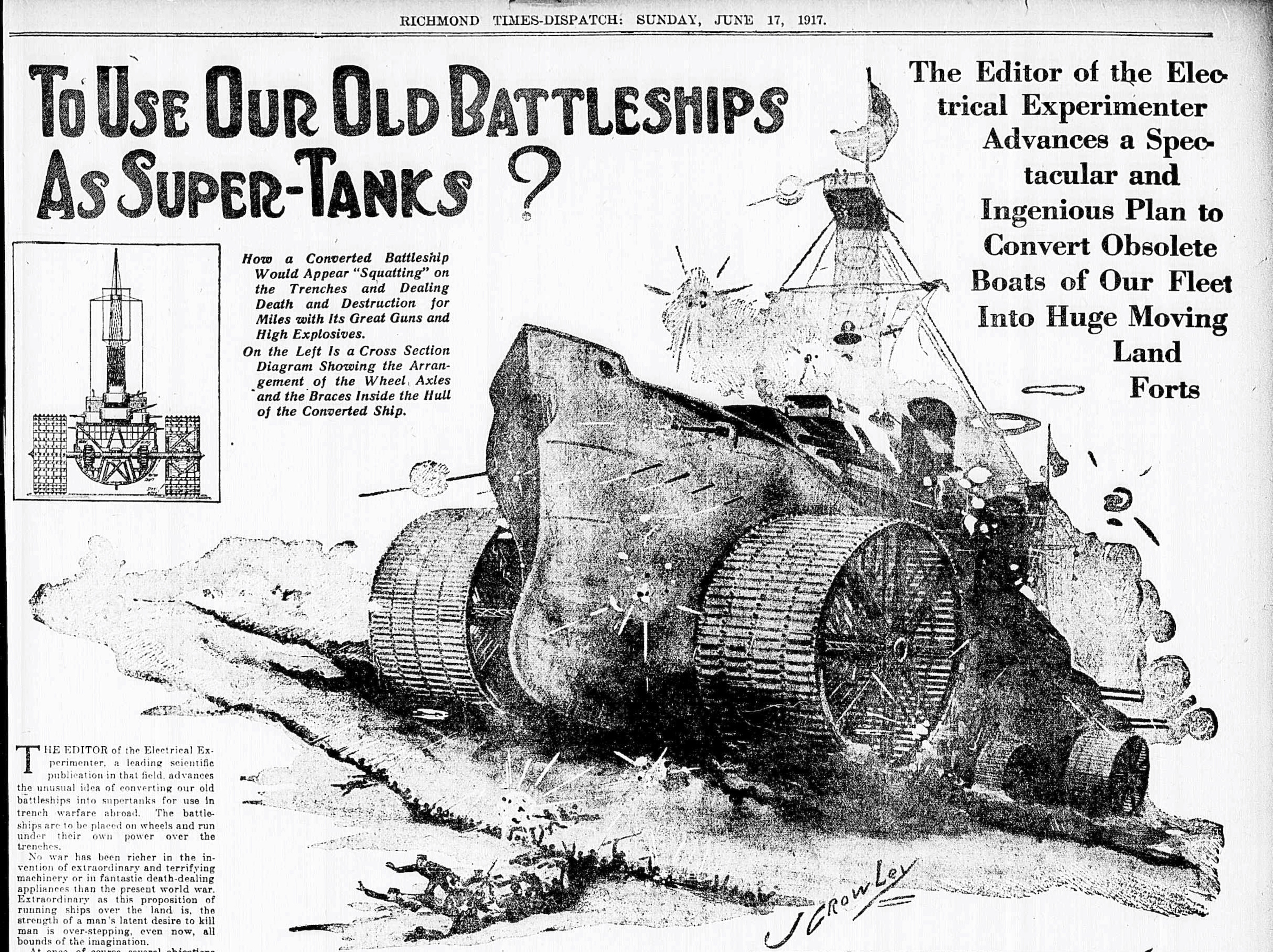 1917년의 미국 리치몬드 타임즈에는 낡은 전함을 전차로 개조해 활용하자는 기사가 실렸습니다. 전함의 양쪽에 거대한 바퀴를 여러 개 달아 육상에서 운용하자는 아이디어였죠.