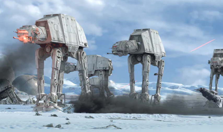 그리고 또 하나, 영화 <스타워즈> 속 AT-AT가 전차와 같은 지상 전투차량이라는 점, 알고 계신가요? 호스 전투에서 AT-AT는 거대한 크기와 화력으로 반란군에게 막대한 피해를 주는데요. 초기 설정에서는 바퀴로 이동하는 전차가 등장할 계획이었지만, 보행 트럭에서 아이디어를 얻어 4족 보행 워커라는 새로운 전투차량을 구상하게 되었다고 합니다.