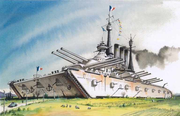 제1차 세계대전 이후의 상상 속 전차와 전장은 갈수록 거대해졌습니다. 전투차량은 자동차 크기를 넘어 하나의 거대한 이동요새로 구상되었죠. 이러한 거대 전차는 현실화되지 않았지만 당시 사람들이 생각한 미래 전장의 모습을 잘 보여주고 있습니다.