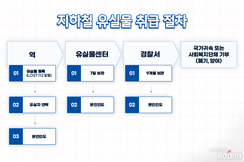 습득된 유실물은 주인을 찾기까지 여러 기관을 거치게 되는데요. 먼저 역에서 습득한 유실물을 경찰청 유실물 통합 포털 LOST112에 등록합니다. 이때 주인에게 바로 인계되지 않는다면 유실물센터로 옮겨져 일주일간 보관되고, 이후에는 경찰서로 옮겨져 9개월간 보관됩니다. 그리고 보관기간동안 주인이 나타나지 않는 물건은 국가귀속 또는 사회복지단체에 기부되거나 필요에 따라 폐기, 양여처리 됩니다.