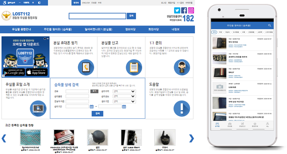 LOST112는 웹사이트와 모바일 앱으로 접속 가능합니다. 이를 통해 유실물 신고뿐만 아니라 접수된 유실물의 종류와 사진, 습득 장소, 보관 기관 등을 확인할 수 있습니다. 또한 습득물이 등록되지 않은 경우, 유실자가 미리 분실물 신고를 해두면 추후에 유실물 발견 알림을 받을 수 있어 물건을 쉽고 빠르게 찾을 수 있는 중요한 수단이 되어줍니다.