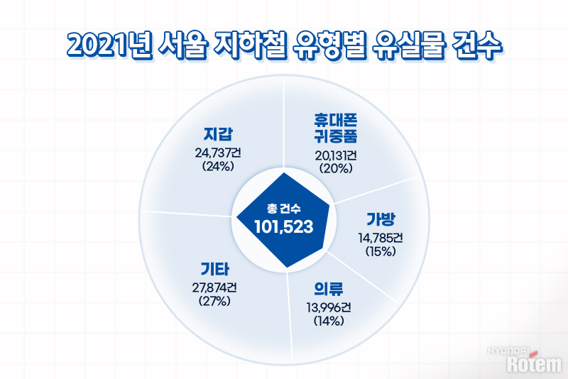 여러분은 혹시 지하철에서 물건을 잃어버린 적 있으신가요? 서울교통공사에 따르면 작년 2021년 한 해 동안 서울 지하철에서 습득한 유실물은 무려 총 10만 1,523건이며, 하루 평균 약 278건이 접수되었다고 하는데요. 접수 건수가 많은 만큼 유실 경로와 물건의 종류도 아주 다양하다고 합니다. 그렇다면 사람들이 지하철에서 제일 많이 잃어버리는 물건은 무엇일까요? 오늘 현대로템 블로그에서는 지하철 유실물 유형과 쉽고 빠르게 잃어버린 물건을 찾을 수 있는 방법까지 함께 알아보았습니다.