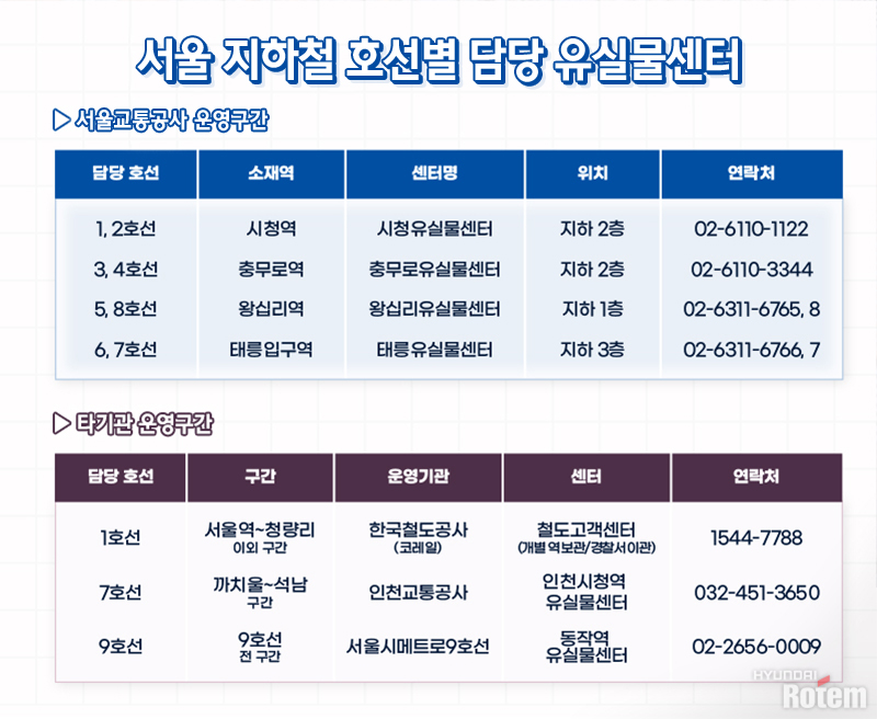 서울 지하철 역사에 유실물센터가 위치한 곳은 시청, 충무로, 왕십리, 태릉입구역으로 총 4곳입니다. 해당 센터는 서울교통공사 운영구간에서 습득된 물건들이 보관되는데요. 이외의 구간에서 발견된 유실물은 한국철도공사(코레일)의 철도고객센터, 인천교통공사의 인천시청역 유실물센터, 서울시메트로9호선의 동작역 유실물센터에서 확인 가능합니다.