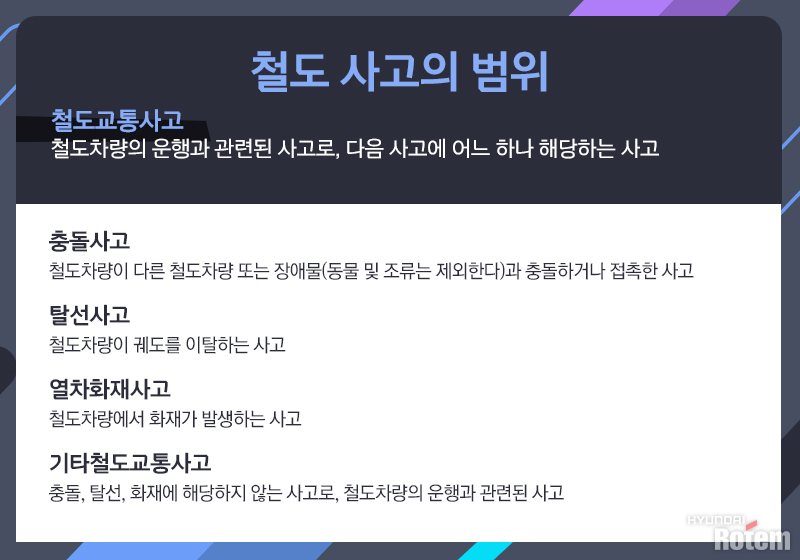 철도안전법에서 정한 철도사고의 범위는 충돌사고, 탈선사고, 열차화재사고, 기타철도교통사고로 나뉩니다. 철도차량은 고속철도, 일반철도, 도시철도로 구분되며, 철도안전법에는 각 차량의 운행환경을 고려한 안전요구사항이 명시되어 있습니다.