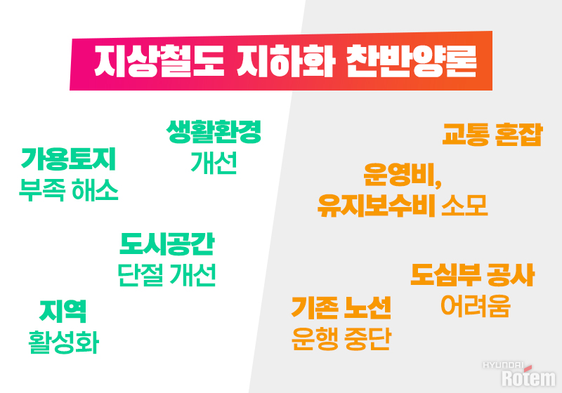 출퇴근길에 전철을 이용하다 보면, 전동차가 지하와 지상을 오가며 달리는 모습을 볼 수 있습니다. 이는 철로가 지상구간과 지하구간에 모두 깔려 있기 때문인데요. 최근에는 지상철도 노선의 지하화에 대한 찬반논의도 꾸준히 이루어지고 있습니다. 오늘 현대로템 알쓸신철은 철도 지하화에 대해 알아두면 유용한 내용을 살펴봅니다.