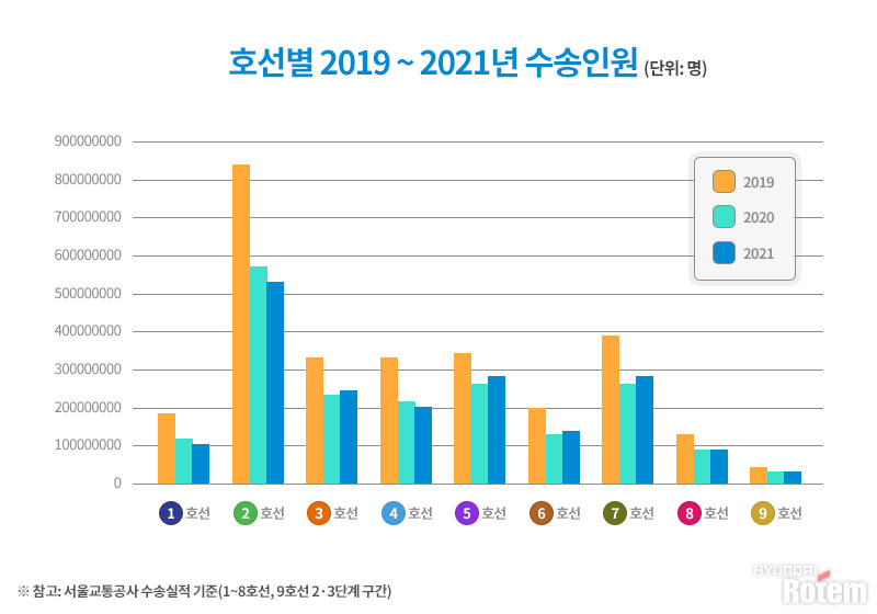코로나 바이러스로 인한 사회적 거리두기 기간 동안 우리의 출퇴근길의 모습은 많이 변했습니다. 그중 무엇보다 재택근무 비중이 높아지면서 대중교통 이용 승객이 현저히 줄었다고 하는데요. 오늘 현대로템 블로그에서는 서울교통공사가 발표한 공사 운영 구간의 연간 지하철 수송 분석 결과를 통해 우리의 일상 모습이 반영된 다양한 지하철 통계를 소개합니다.