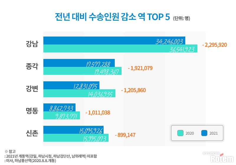 연간 일평균 수송인원 1위를 기록한 강남은 의외로 전년대비 수송인원 감소폭이 가장 큰 역에서도 1위를 차지했습니다. 그 뒤로 종각, 강변, 명동, 신촌역이 따랐는데요. 강남과 종각역은 각종 회사가 밀집한 업무지구이자 상업지구로, 코로나로 인한 재택근무 활성화가 크게 영향을 미친 것으로 예상됩니다. 또, 동서울터미널이 위치해 경기도 지역 버스가 서울로 진입하며 해당 승객들의 주 수요처인 강변역은 5호선 하남연장선 및 경강선 등 경기도 내 지하철 노선이 개통됨에 따라 줄어든 버스 이용객의 영향을 받은 것으로 추정됩니다.