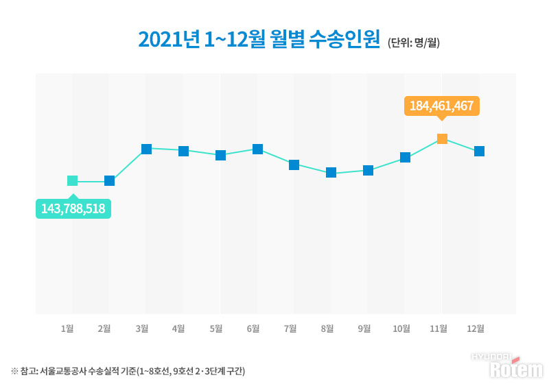 한편, 2021년 월별 수송인원을 보았을 때 1월이 약 1억 4,378만 명으로 가장 적었으며, 같은 달 1일 수송인원이 약 143만 명에 그치며 한 해 최저 수송인원을 기록한 날이 되었습니다. 반대로 11월은 약 1억 8,446만 명으로 열두 달 중 수송인원이 가장 많았는데요. 역시 같은 달 26일에 무려 약 695만 명이 서울 지하철을 이용하며 한 해 최다 수송인원을 기록했습니다.