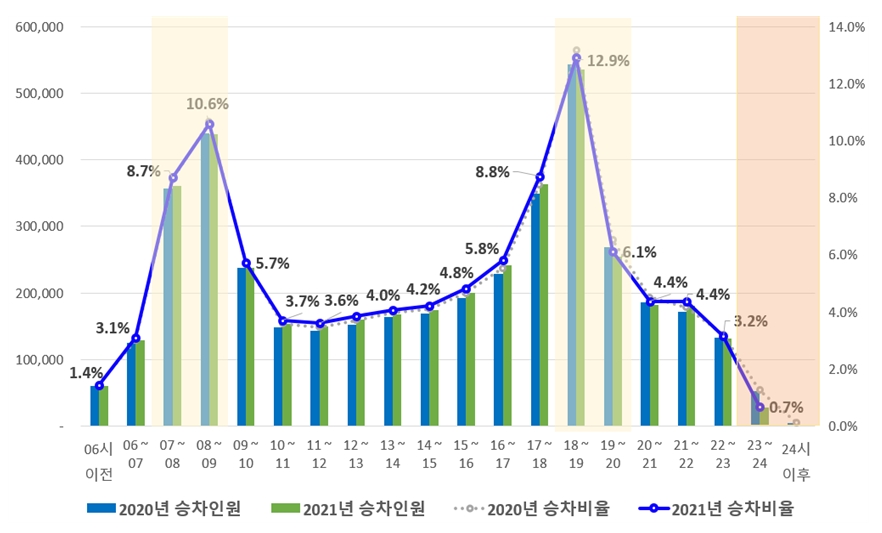 재택근무가 확대되었다고 하지만 평일 출퇴근 시간의 지하철은 여전히 붐빕니다. 이는 시간대별 서울 지하철 이용 인원 추이에도 고스란히 드러나는데요. 오전 7~9시와 오후 18~20시가 전체 이용객의 약 1/3로, 38.4%를 차지합니다. 그리고 심야 시간대인 23~자정까지 이용객이 가장 적은 수치로 0.7% 수준을 기록합니다.
