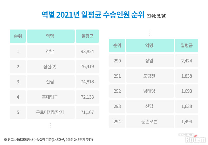 오늘은 다양한 기준의 2021년 서울 지하철 통계를 살펴보았습니다. 그 안에는 지난 한해 동안 시민들의 일상과 도시 변화의 흐름이 고스란히 담겨 있는데요. 그만큼 지하철은 우리 생활에 밀접해 있음을 알 수 있습니다. 올해에는 코로나19로 움츠러들었던 우리 일상이 드디어 본격적으로 회복하며 대중교통 수요가 크게 증가할 것으로 예상되는데요. 현대로템 역시 여러분의 삶이 더욱 안전하고 편리해질 수 있도록 끊임없이 노력하겠습니다!