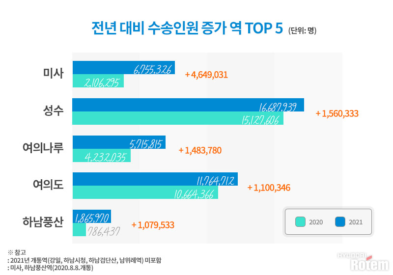 먼저, 전년 대비 수송인원 증가폭이 큰 역은 미사, 성수, 여의나루, 여의도, 하남풍산역인데요. 이중 미사역과 하남풍산역은 2020년 8월 8일에 개통되었기 때문에 2021년 연간 총 이용 인원수에서 자연스레 큰 증가폭을 기록하게 됩니다. 한편, 성수역은 카페거리 및 수제화거리 등 역 주변이 새롭게 명소화되면서 늘어난 방문객과 소규모 회사 입점 등의 요인이 있습니다. 여의나루역과 여의도역은 작년 2월 인근에 현대백화점 더현대 서울이 개장하며 이를 찾는 이용객들의 수요가 늘어난 점이 반영된 것으로 보입니다.