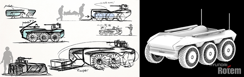HR-셰르파는 무인주행, 원거리 탐지 정찰, 위험물 탐지, 물류 및 부상자 수송 등 다양한 임무를 수행하는 무인차량인데요. 이를 디자인할 당시에 스케치 단계부터 무기라는 개념뿐만 아니라 사용자의 관점에서 업무 수행에 도움을 줄 수 있도록 초점을 맞춰 접근했습니다.