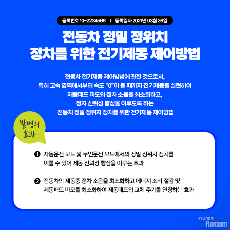 먼저 소개드릴 현대로템의 특허는 지난해 정식 특허 등록된 현대로템의 전동차 정밀 정위치 정차를 위한 전기제동 제어방법입니다.