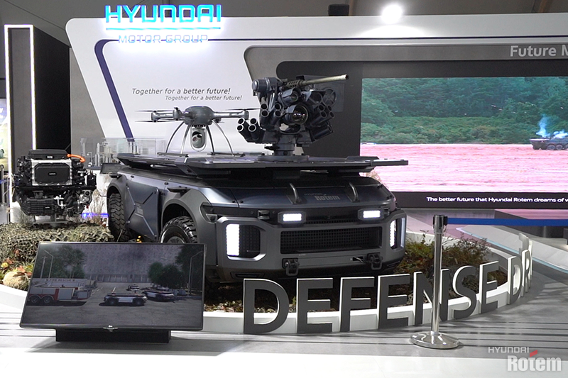 지난 ADEX 2021에서 현대로템이 처음 공개한 콘셉트 차량 디펜스 드론은 오염물질을 배출하지 않는 수소연료전지 기반 무인 플랫폼입니다. 최고 속도 120km/h의 주행 능력과 1회 충전 시 450km 이상의 주행거리는 물론, 자율주행과 원격주행 등 다양한 기능을 갖췄죠. 운용 목적에 따라 다양한 임무장비 장착이 가능하고 수소전기차에 기반을 두고 있어 연료 효율이 좋은 친환경 제품입니다.