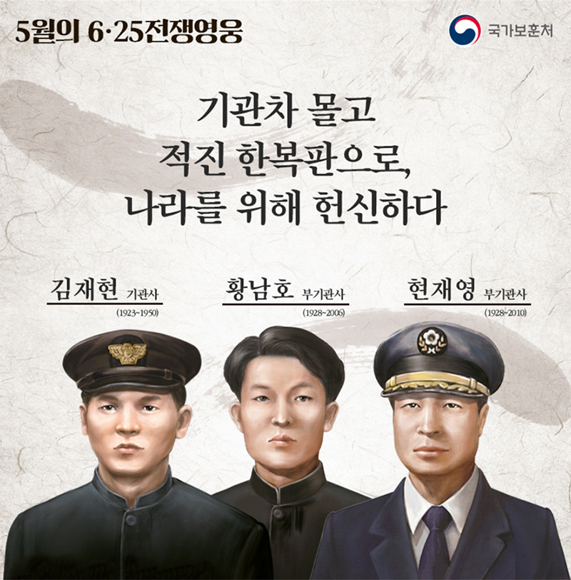 당시 철도인들은 6·25 전쟁을 ‘철도 전쟁’이라고 불렀습니다. 철도 운행 없이는 군수물자 및 병력 수송이 불가능할 정도였기 때문이죠. 그리고 1950년 7월, 대전이 이미 북한군에게 함락된 상황 속에 남겨진 우군과 군수물자가 담긴 화차를 회수하기 위한 철도 작전이 세워졌습니다. 대전으로 향하는 모든 철로를 북한군이 통제하고 있었기 때문에 증기기관차를 몰고 그 길을 지난다는 것은 죽음을 각오하는 일이었기 때문에 누구도 선뜻 나서지 못했습니다. 그런데 그때 임무 수행에 자진해 나선 세 사람이 있었습니다. 바로 대전기관차사무소 소속으로 충북 영동역에서 군수물자 후송 작전에 참여 중이었던 김재현 기관사와 황남호, 현재영 부기관사였습니다.