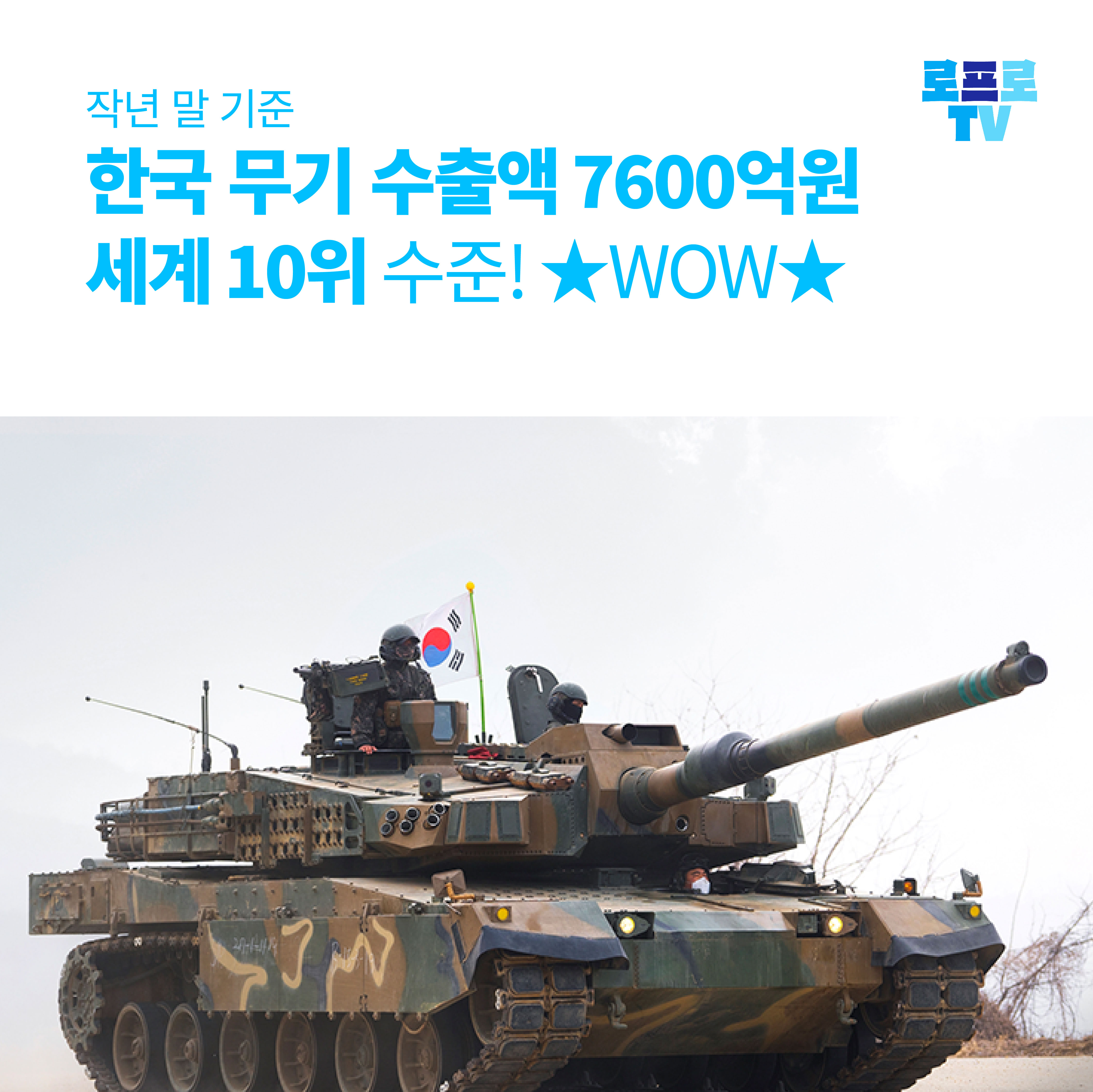 스웨덴 싱크탱크 스톡홀름국제평화연구소(SIPRI)에 따르면 작년 말 기준 한국의 무기 수출액은 5억6600만달러입니다. 22일 현재 환율 기준으로 7600억원에 달하는 것으로 세계 10위 수준입니다.