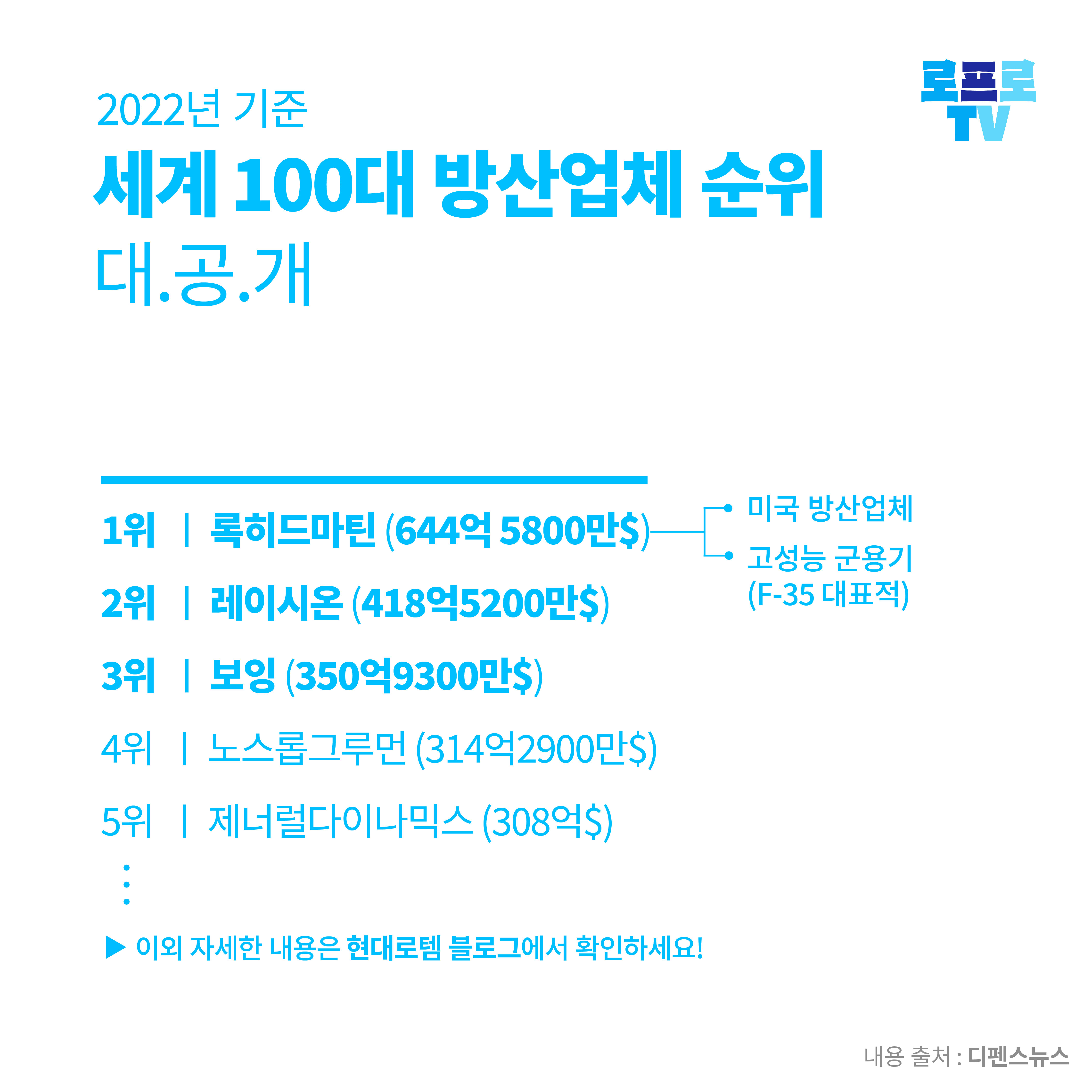 2위는 레이시온(418억5200만달러), 3위는 보잉(350억9300만달러), 4위와 5위에는 노스롭 그루먼(314억2900만달러), 제너럴다이나믹스(308억달러)로 자리를 지켰습니다. 모두 미국 기업입니다.