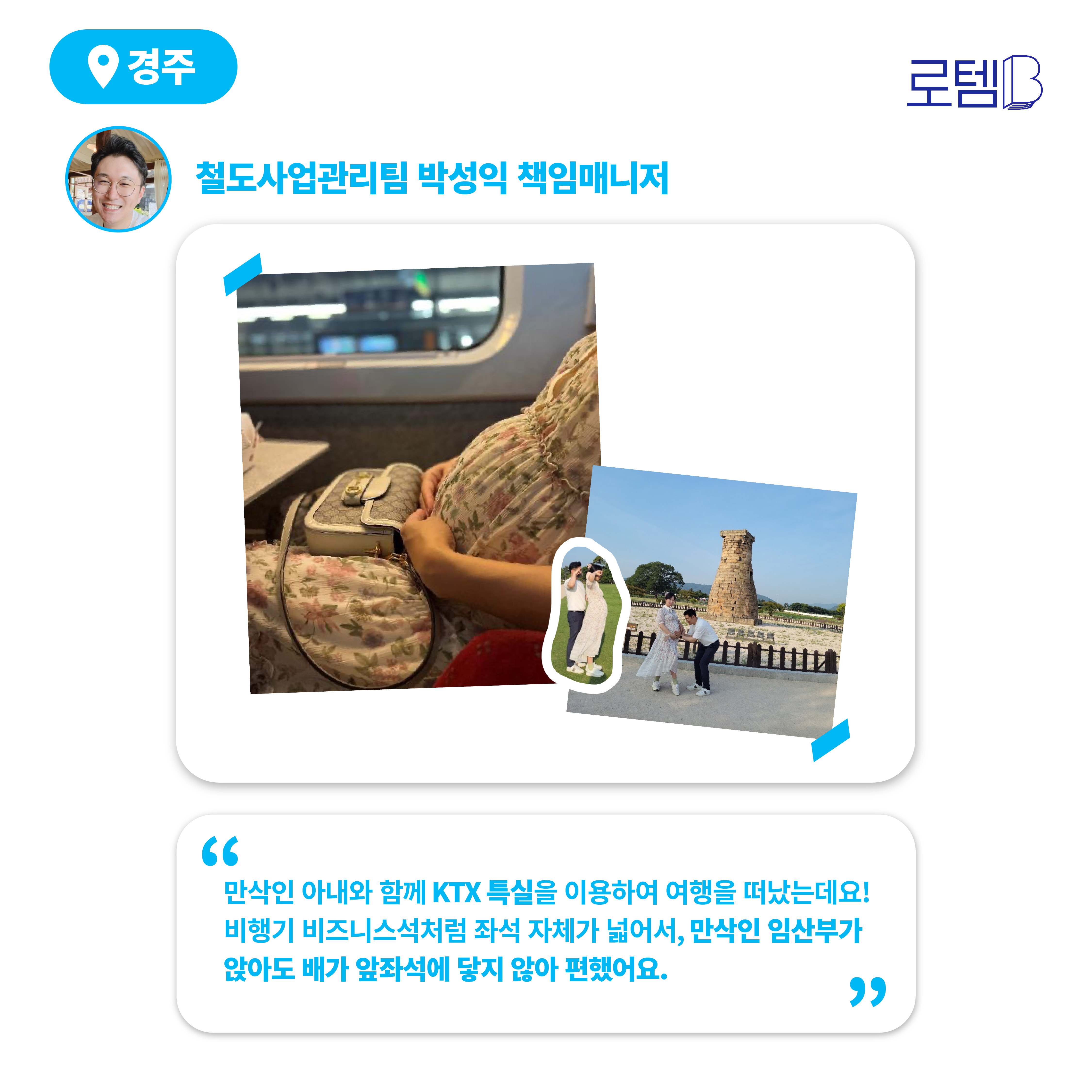 먼저, 경주행 열차로 가보겠습니다. 만삭인 아내와 함께 열차에 올라탄 철도사업관리팀 박성익 책임매니저는 KTX 특실을 이용하여 편하게 태교 여행을 떠났는데요. KTX 특실은 일반실에 비해 앞, 뒤 간격 뿐만 아니라 좌석 그 자체로도 넓어 만삭인 임산부가 앉아도 배가 앞좌석에 닿지 않아 편했다고 합니다.