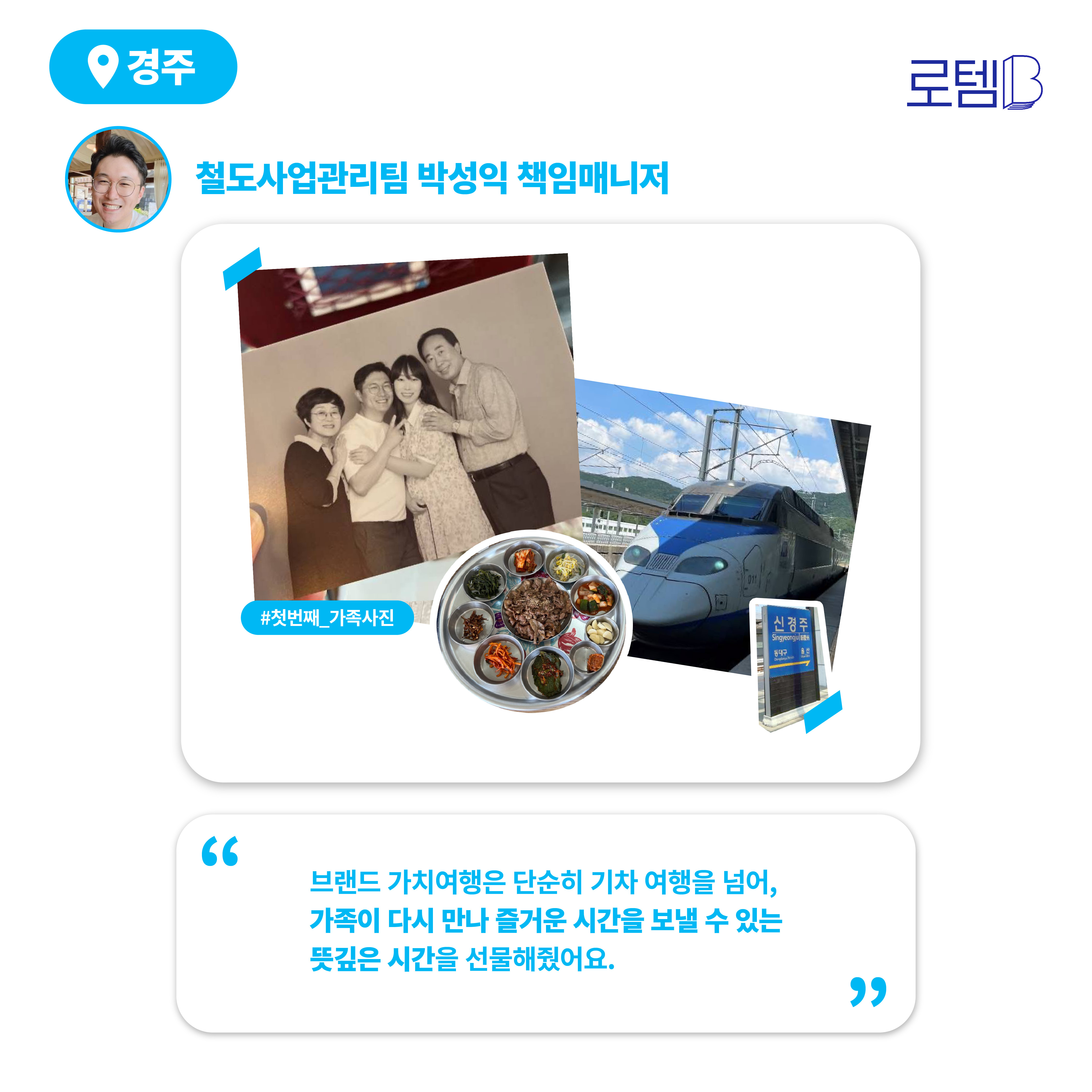창밖 풍경을 바라보다 보니 어느새 경주에 도착했는데요. 요즘 뜨고 있는 한옥거리 ‘황리단길’을 걷다가 우연히 사진 스튜디오에 들러 첫번째 가족사진을 남겨봤다고 해요. 박성익 책임매니저는 “브랜드 가치여행은 단순히 기차 여행을 넘어, 가족이 다시 만나고 즐거운 시간을 보낼 수 있는 뜻깊은 시간을 선물해준다”고 전했습니다.