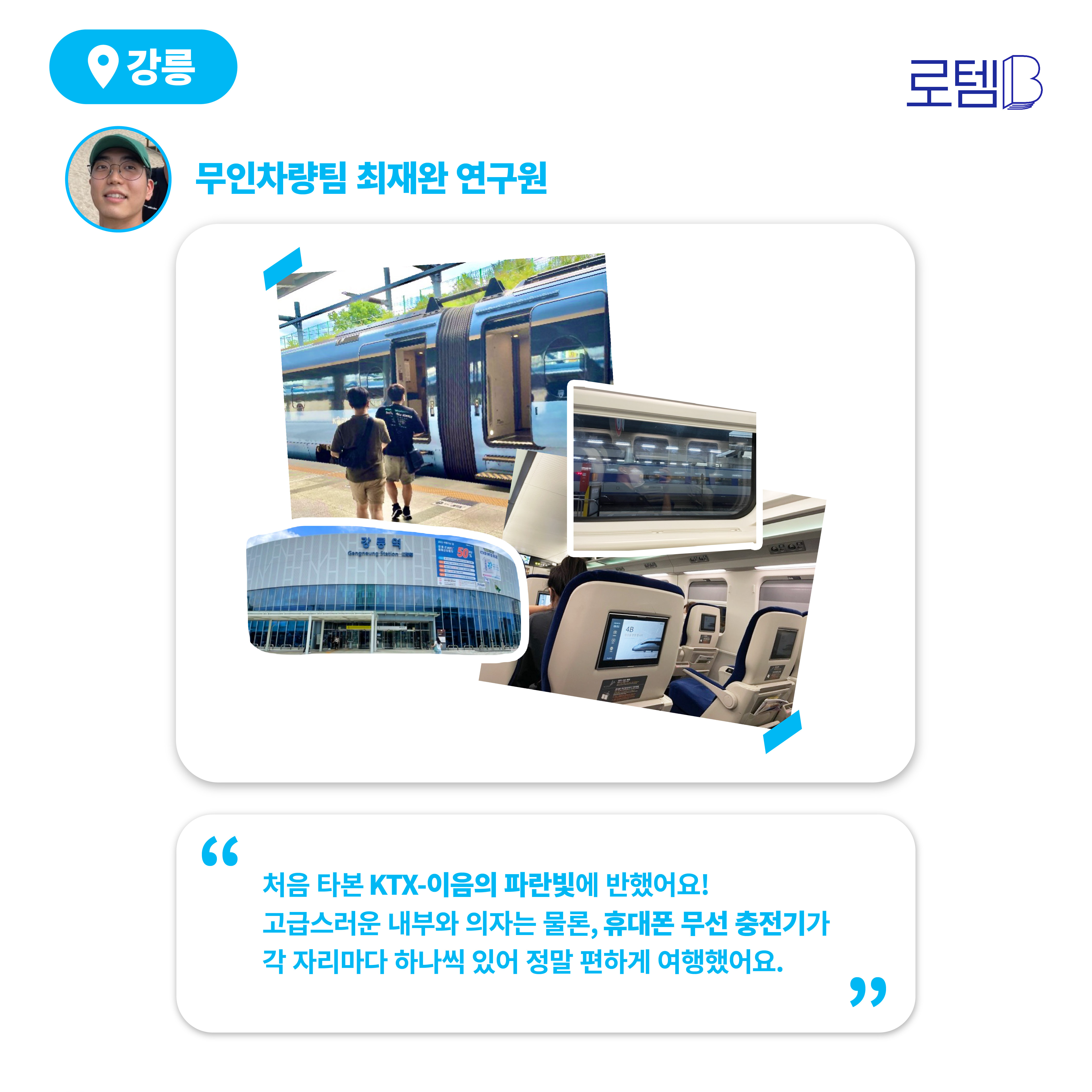 무인차량팀 최재완 연구원은 KTX-이음을 타고 여행을 떠났는데요. 처음 타본 KTX-이음의 파란빛에 반했다고 합니다. KTX-이음은 파랑이 굉장히 강렬한 고속열차입니다.