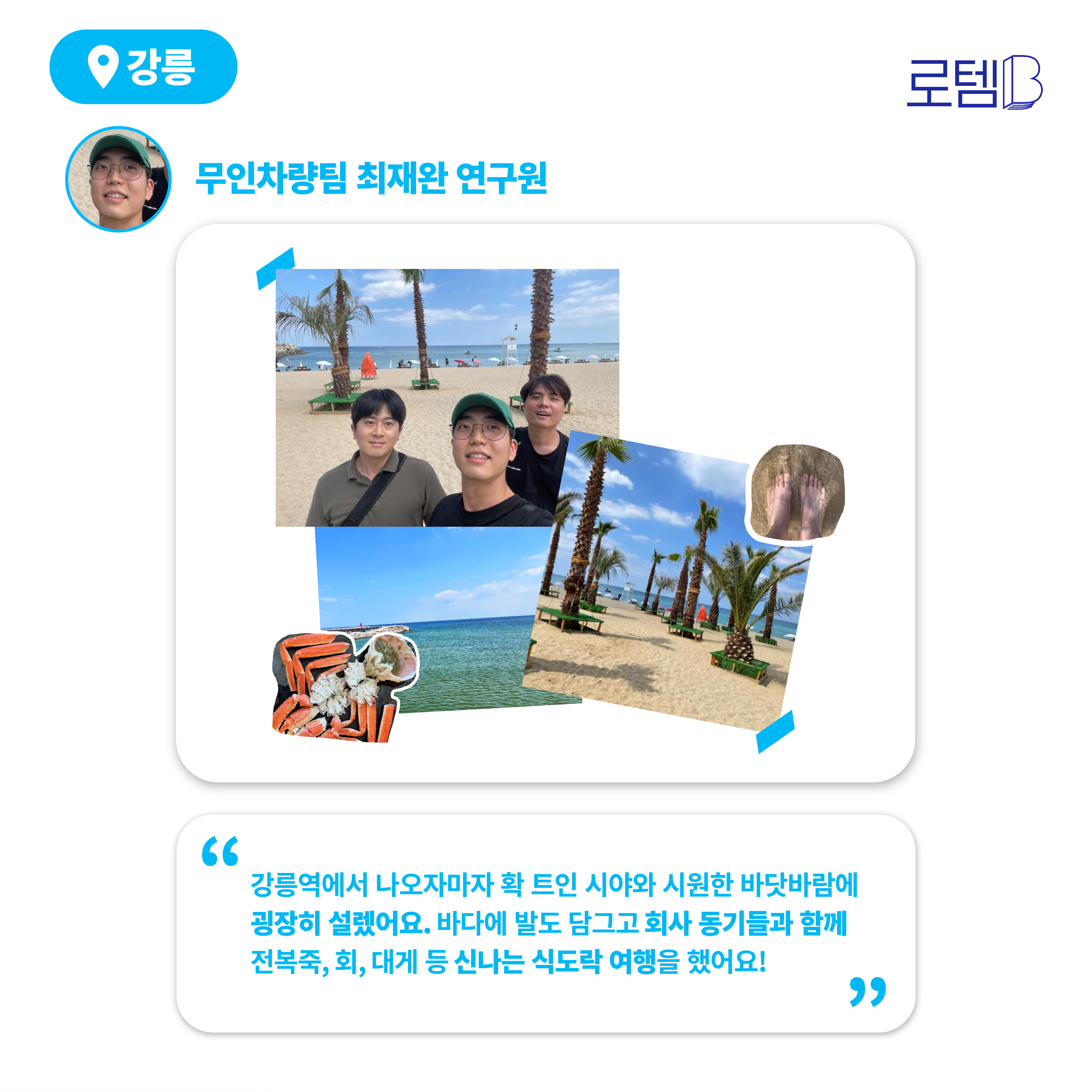 강릉역에서 나오자마자 확 트인 시야와 시원한 바닷바람이 맞아줘 굉장히 설레었다고 하는데요. 바다에 발도 담그고 회사 동기들과 함께 전복죽, 회, 대게, 가자미 구이, 초밥 등 신나는 식도락 여행을 했다고 전해주었어요.