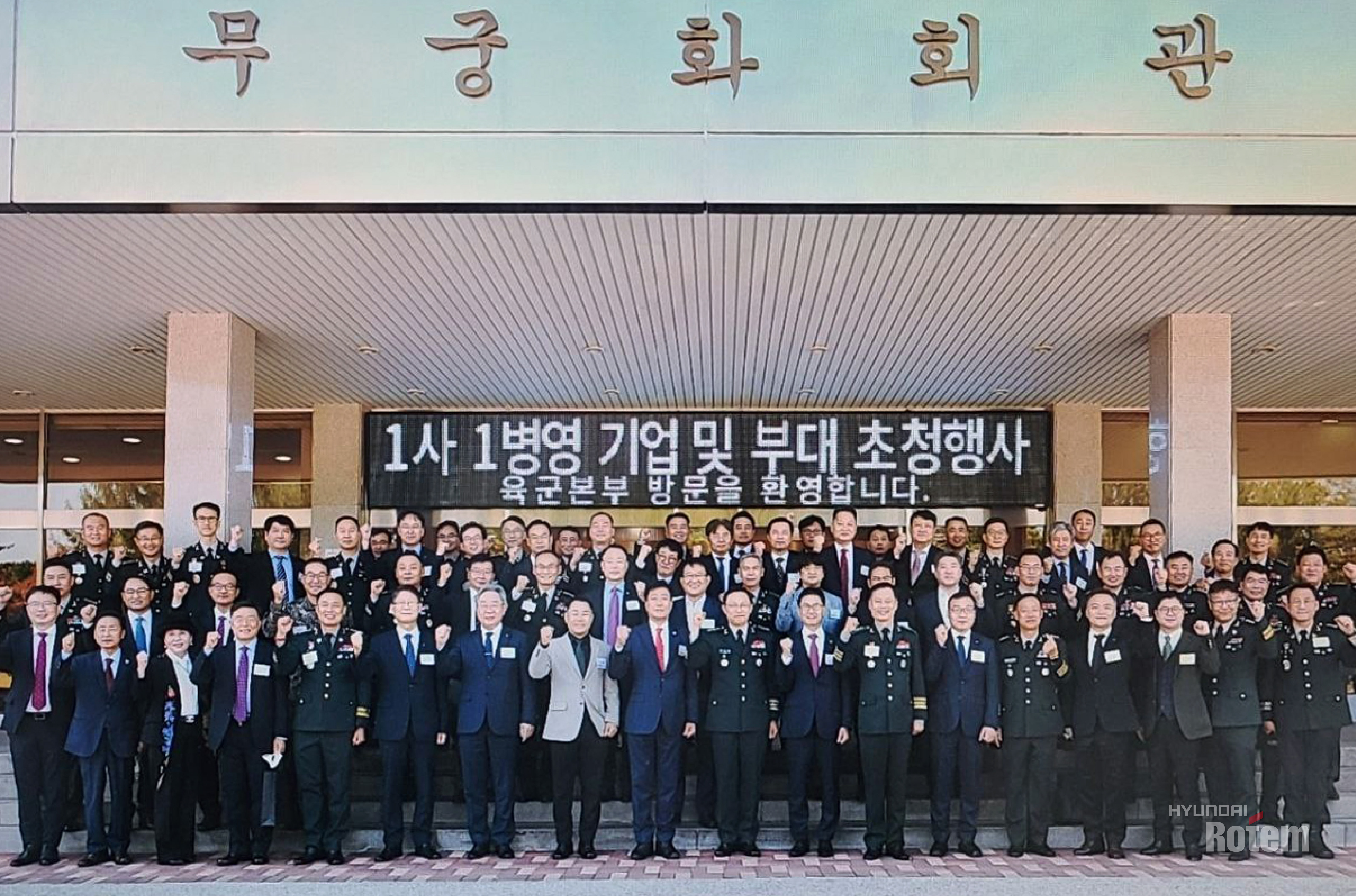 육군 관계자들을 비롯해 1사1병영 결연 기업 및 부대 대표자들이 참가한 이날 간담회는 상호 교류를 활성화하고 협력 관계를 증진코자 마련됐습니다. 현대로템은 올해 육군 군수사령부(이하 군수사)와 1사1병영 협약을 맺은 바 있습니다.