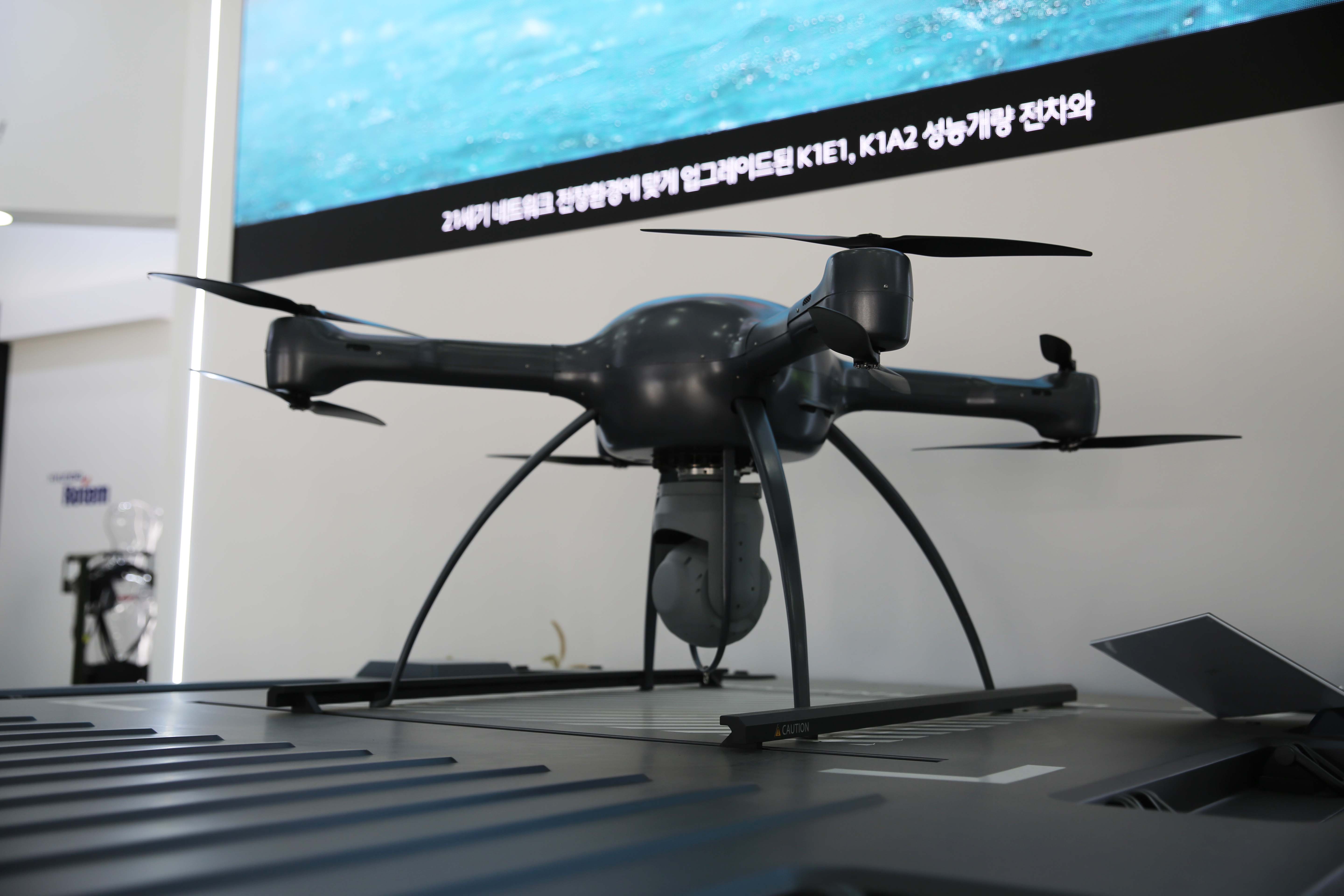 국내 국방 분야 최초의 수소연료전지 기반 무인 플랫폼인 디펜스 드론이에요. 비행 드론이 뜨고 내릴 수 있는 승강 포트를 갖추고 있고 원격으로 화력지원이 가능한 원격무장장치(RCWS, Remote Controlled Weapon Station)도 장착돼 있어요.