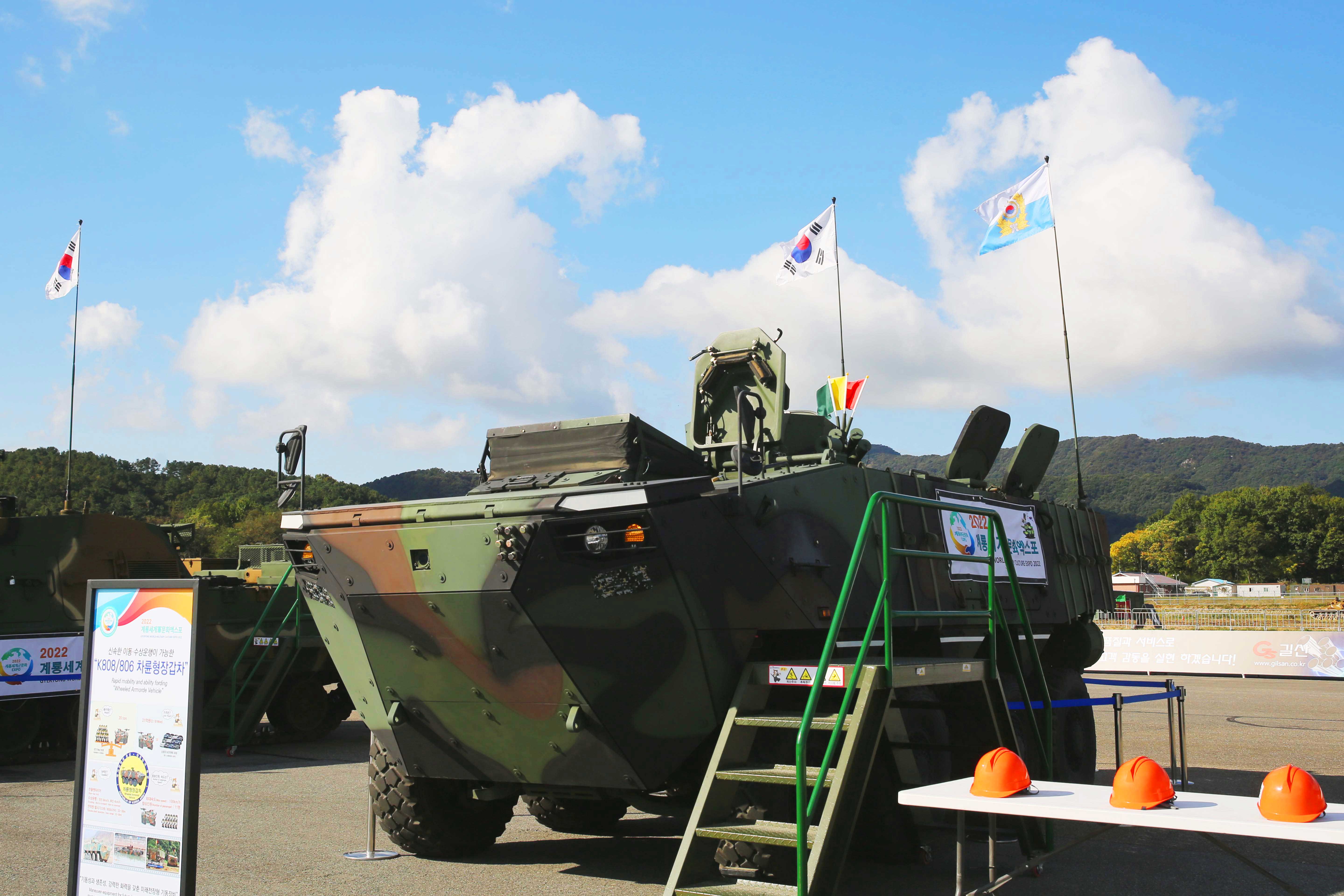 두꺼운 풍채에 단단함이 묻어나는 K808 차륜형장갑차가 바로 옆에 보이네요. 최고시속 100km와 항속거리 600km의 스펙으로 우수한 기동성을 가지고 있어요. K2전차처럼 전차 위에 올라타 체험할 수 있어 흥미로웠어요.