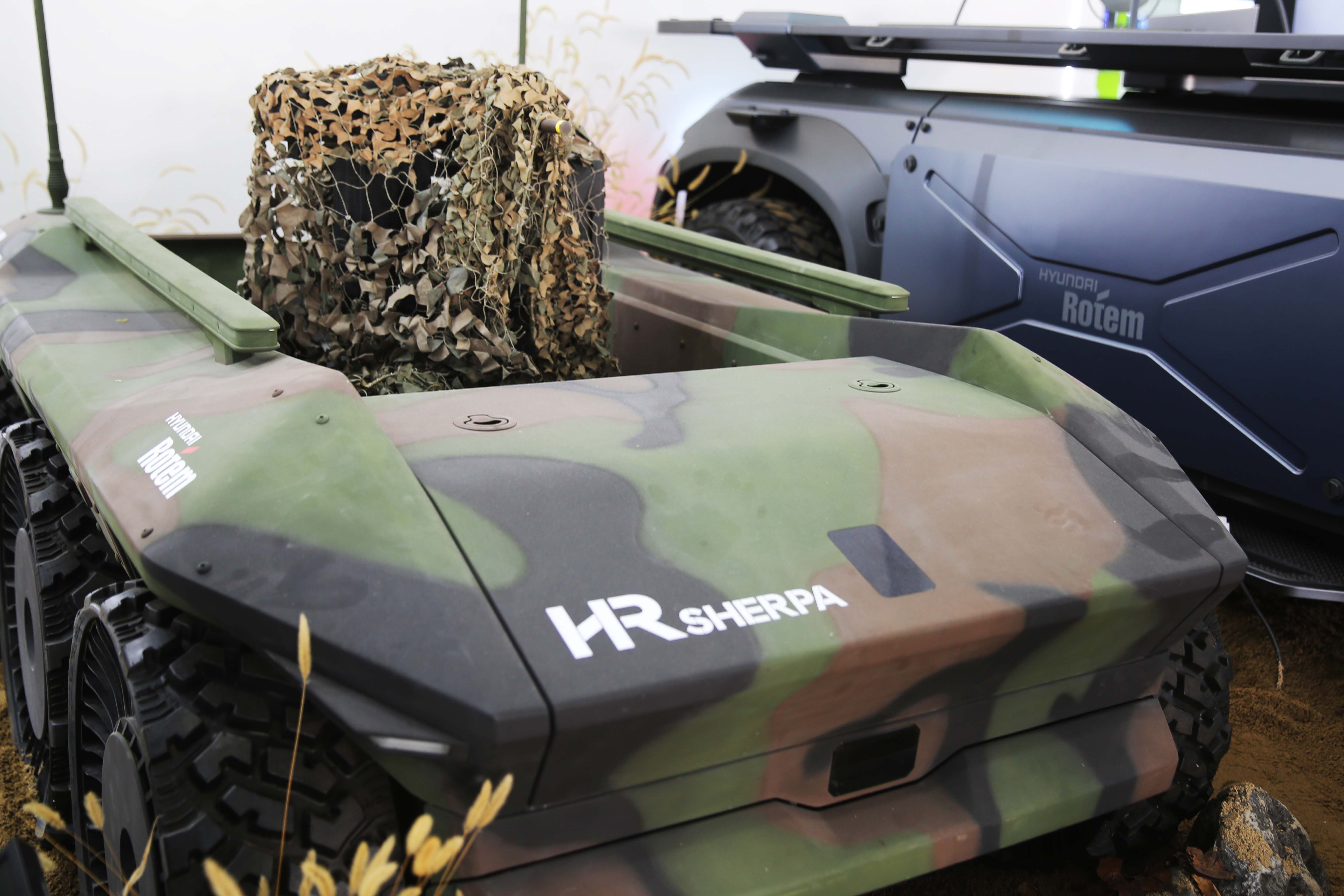 4차산업융합관 이름처럼 4차 산업혁명 무인 체계의 포문을 연 다목적 무인차량, HR 셰르파가 전시돼 있어요. 원격으로 타격을 결정할 수 있고, 자율주행 기능처럼 첨단 센서 기술들이 장착돼 있어 작지만 옹골찬 느낌을 받았어요.
