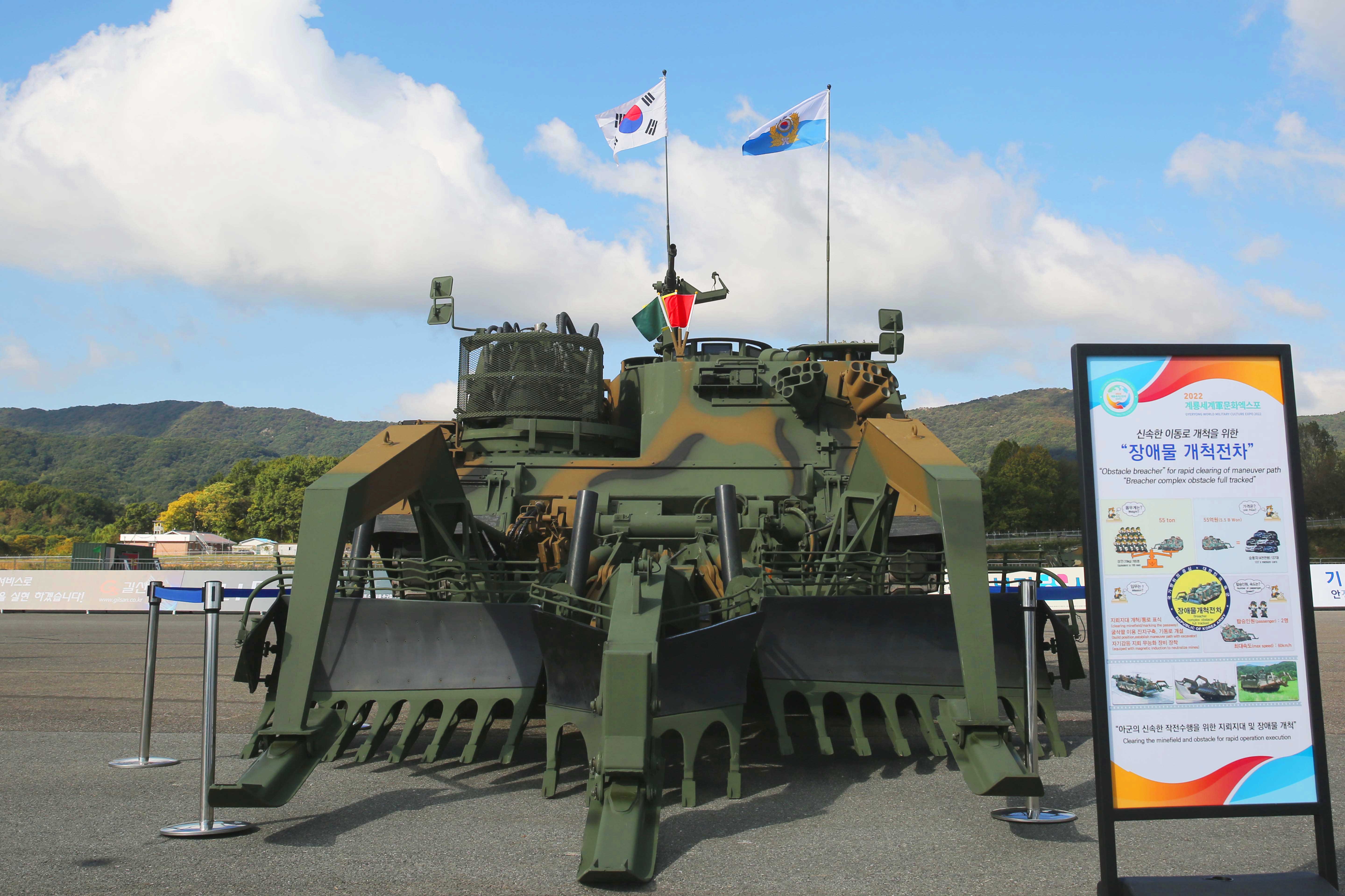 앞서 소개한 K2, K808, K1 구난전차 등 기동성 우수한 전차들이 신속하게 이동할 수 있도록 이동로를 만들어주는 장애물 개척전차에요. 날카로워 보이는 굴삭팔이 인상적이었어요.
