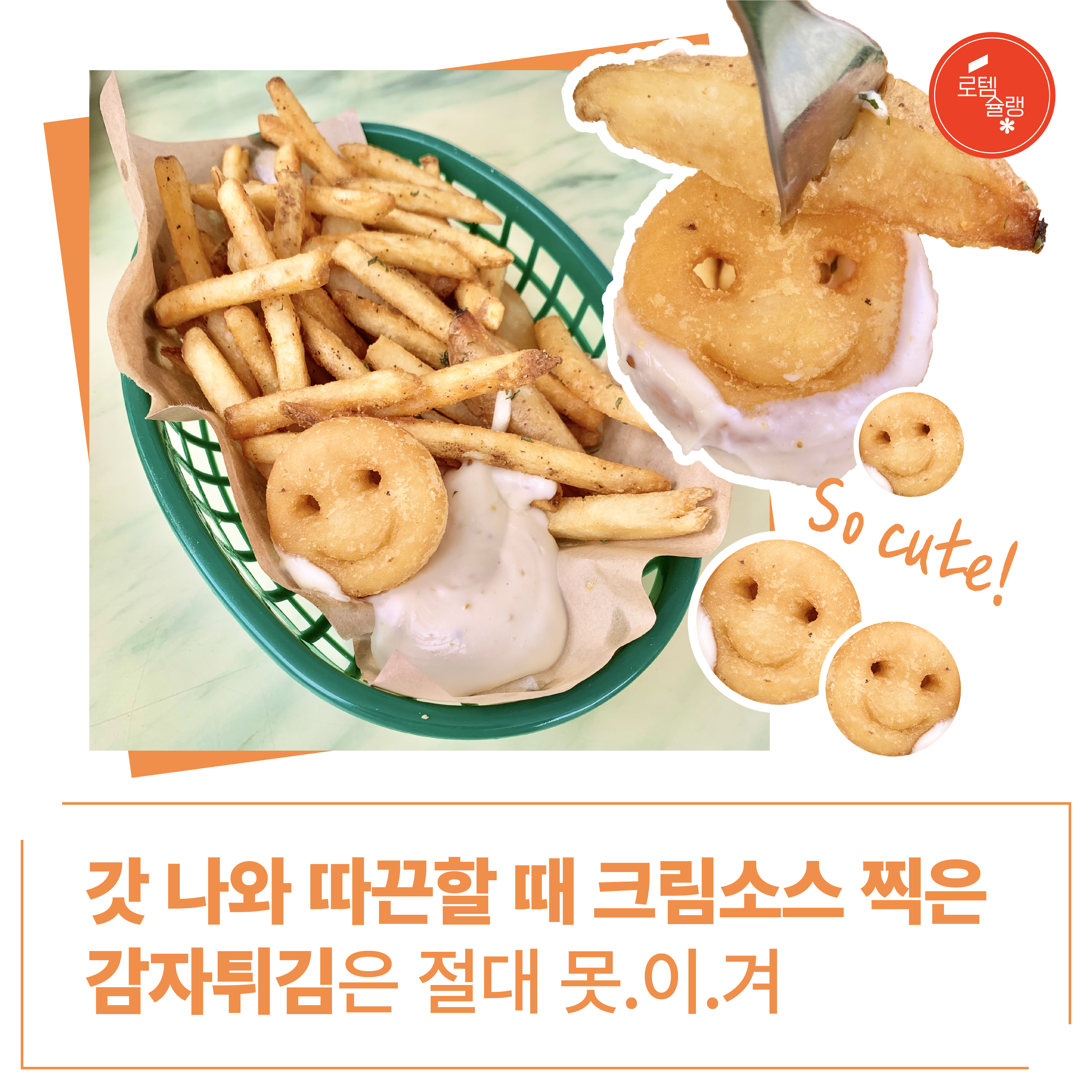 함께 나온 스마일 모양의 감자튀김도 너무 귀여워서 먹기가 미안했어요. 그래도 ‘따끈따근할 때 먹어야지’라는 생각으로 크림소스에 콕 찍어 한입 먹으니 바삭함과 촉촉함이 입안 가득! 하나도 안 남기고 냠냠 다 먹었답니다.