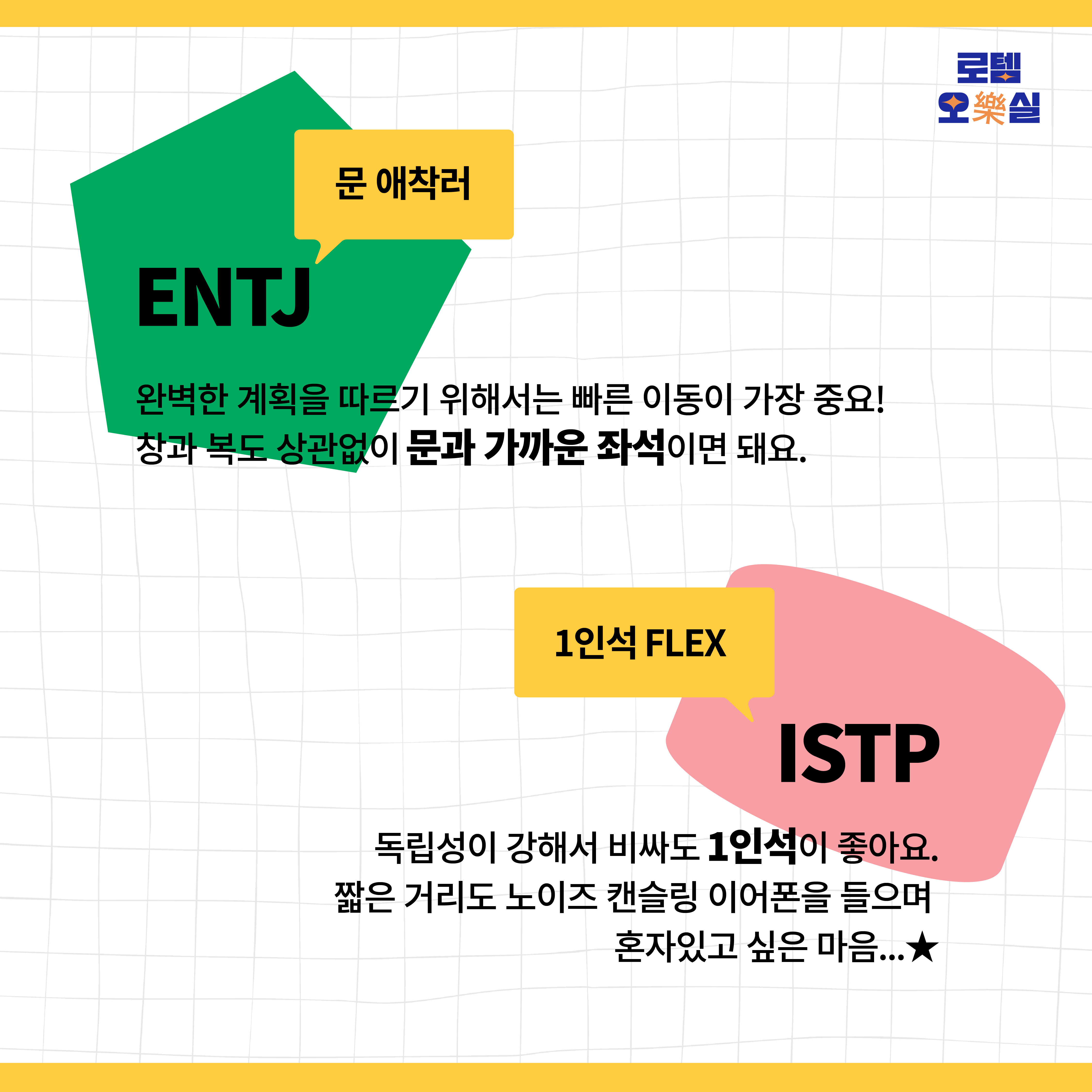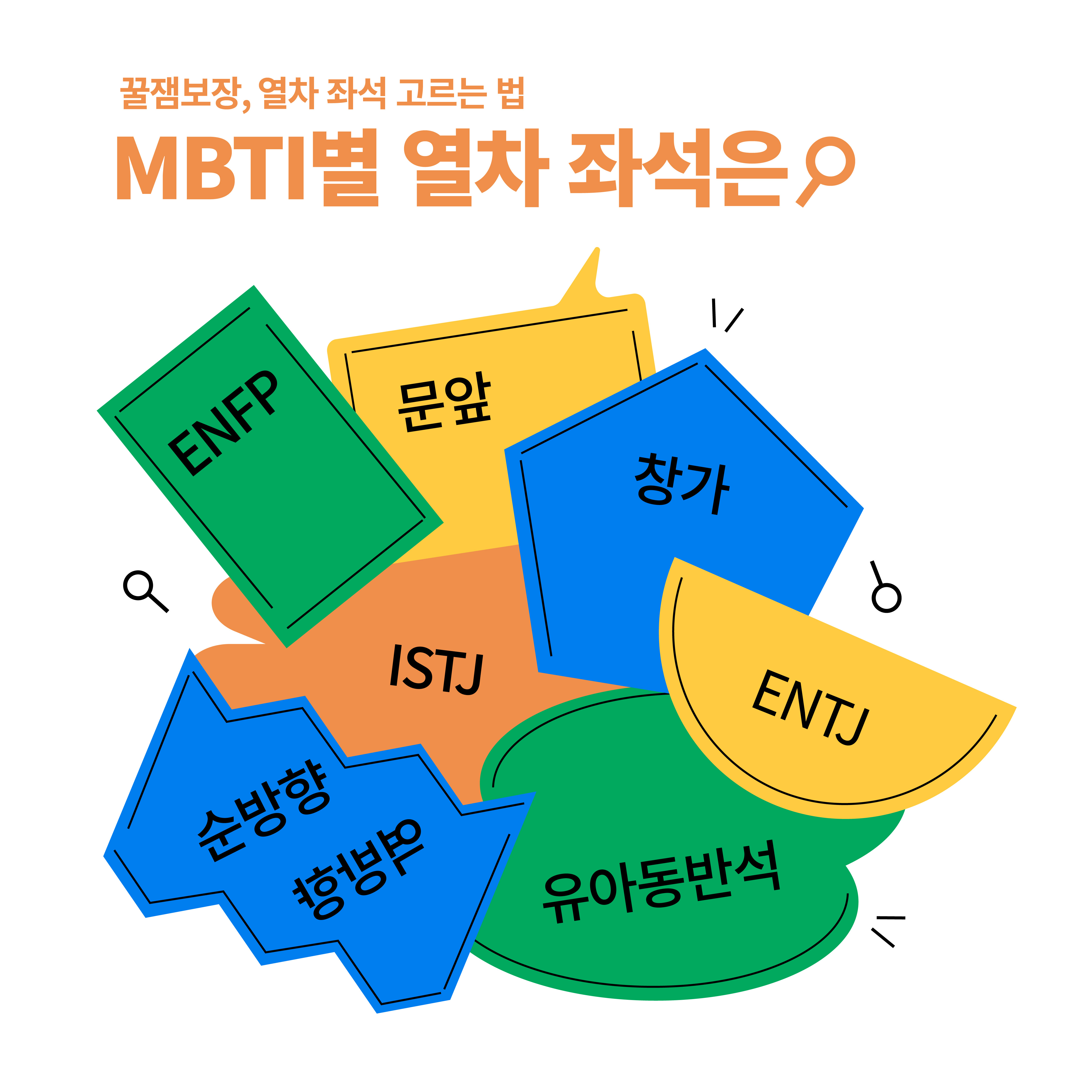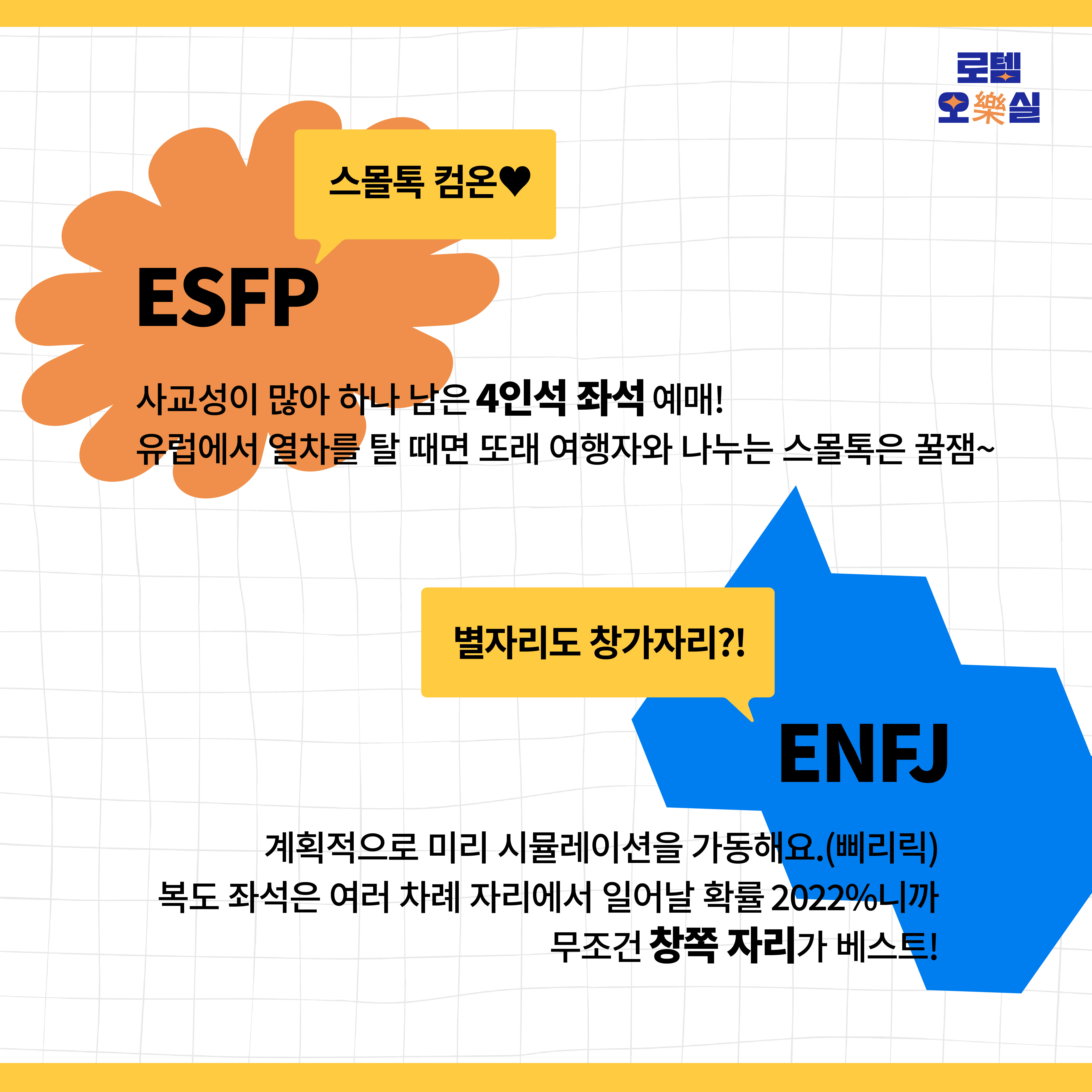이보다 더 완벽한 계획성을 가지며 진취적인 ENTJ는 창, 복도는 상관 없어요. 열차에 오르고 내릴 때 빠른 이동이 필요해요. 계획한 다음 일정을 차질 없이 해결하기 위해서는 지체할 시간이 없기 때문이에요. 문과 가까운 좌석 최대한 사수!