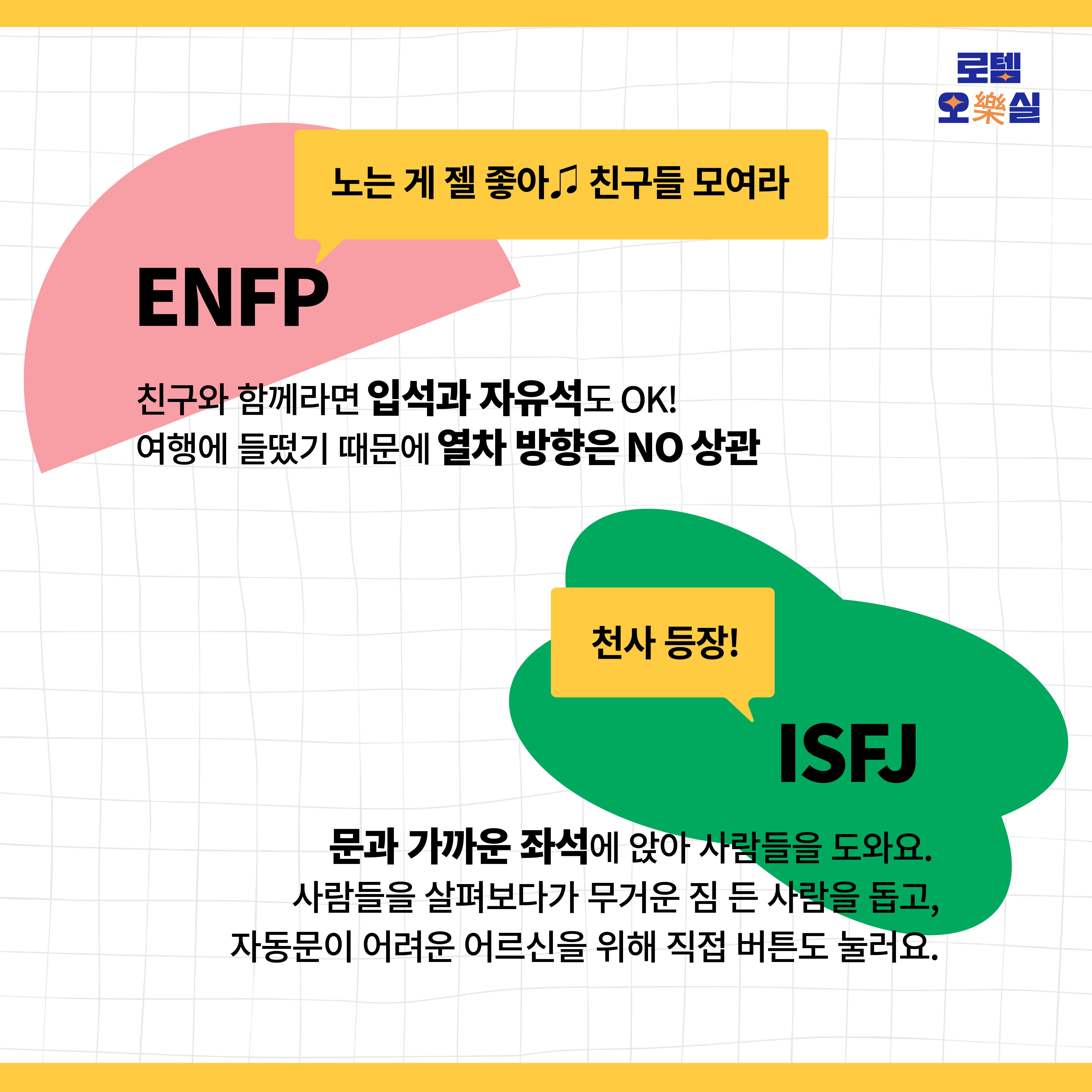 헌신적인 성격의 ISFJ는 문과 가까운 좌석에 앉아요. 사람들을 돕기 위해서죠. 열차에 올라탈 때 무거운 짐을 든 사람을 도와주고, 자동문이 어려운 어르신들을 위해 직접 버튼을 눌러요. 도움이 필요한 사람이 있나 살펴보며 묵묵히 타고 가요.