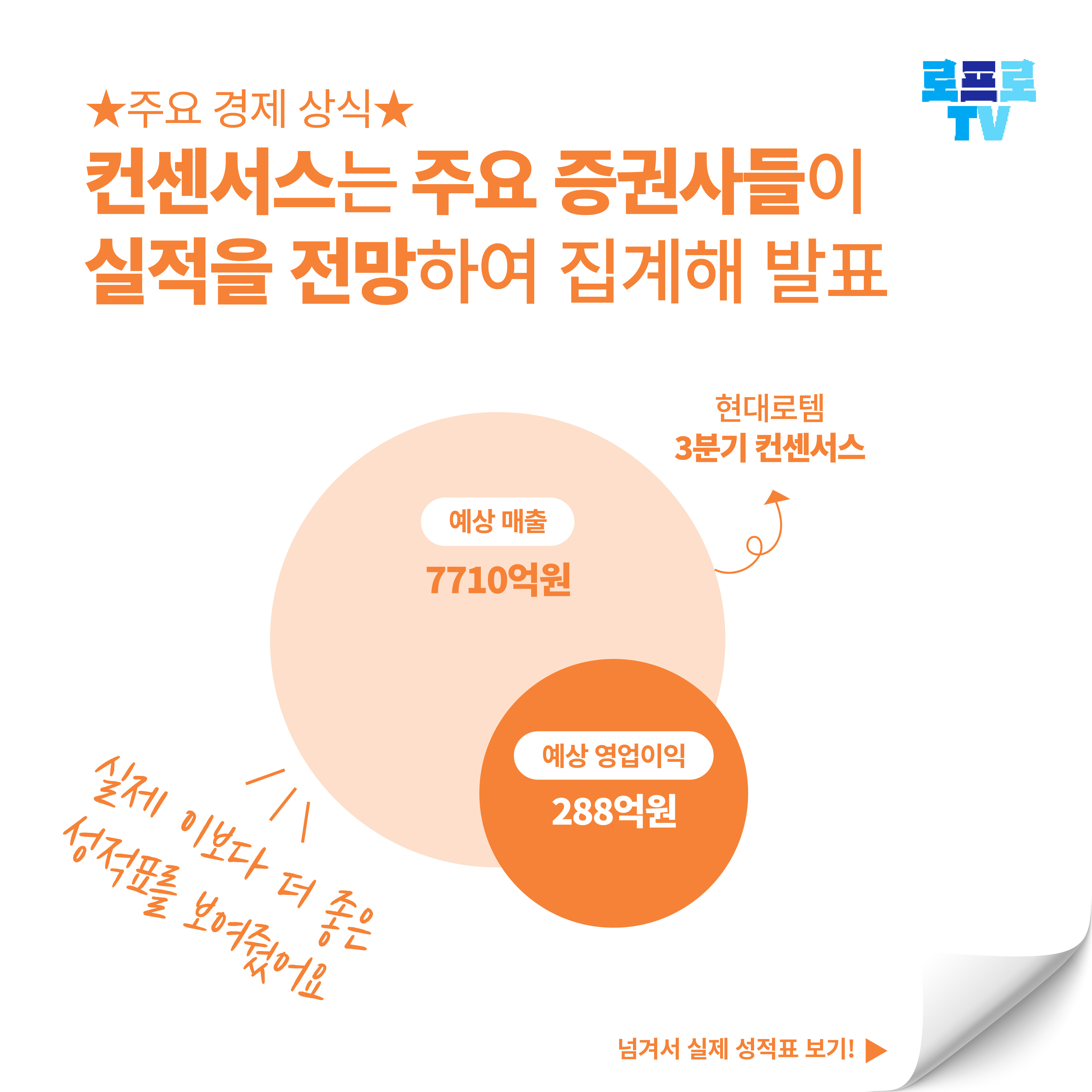기업들이 실적을 공식 발표하기전 주요 증권사들은 실적을 미리 전망한 뒤 집계해 발표하는데요. 이것을 ‘컨센서스’라고 해요. 기존의 주요 데이터를 바탕으로 실적을 가늠해보는 것이죠. 증권사들은 현대로템의 올해 3분기 매출액과 영업이익을 각각 7710억원과 288억원으로 추정했는데 실제 이보다 더 좋은 성적표를 보여줬습니다. 짝짝짝!