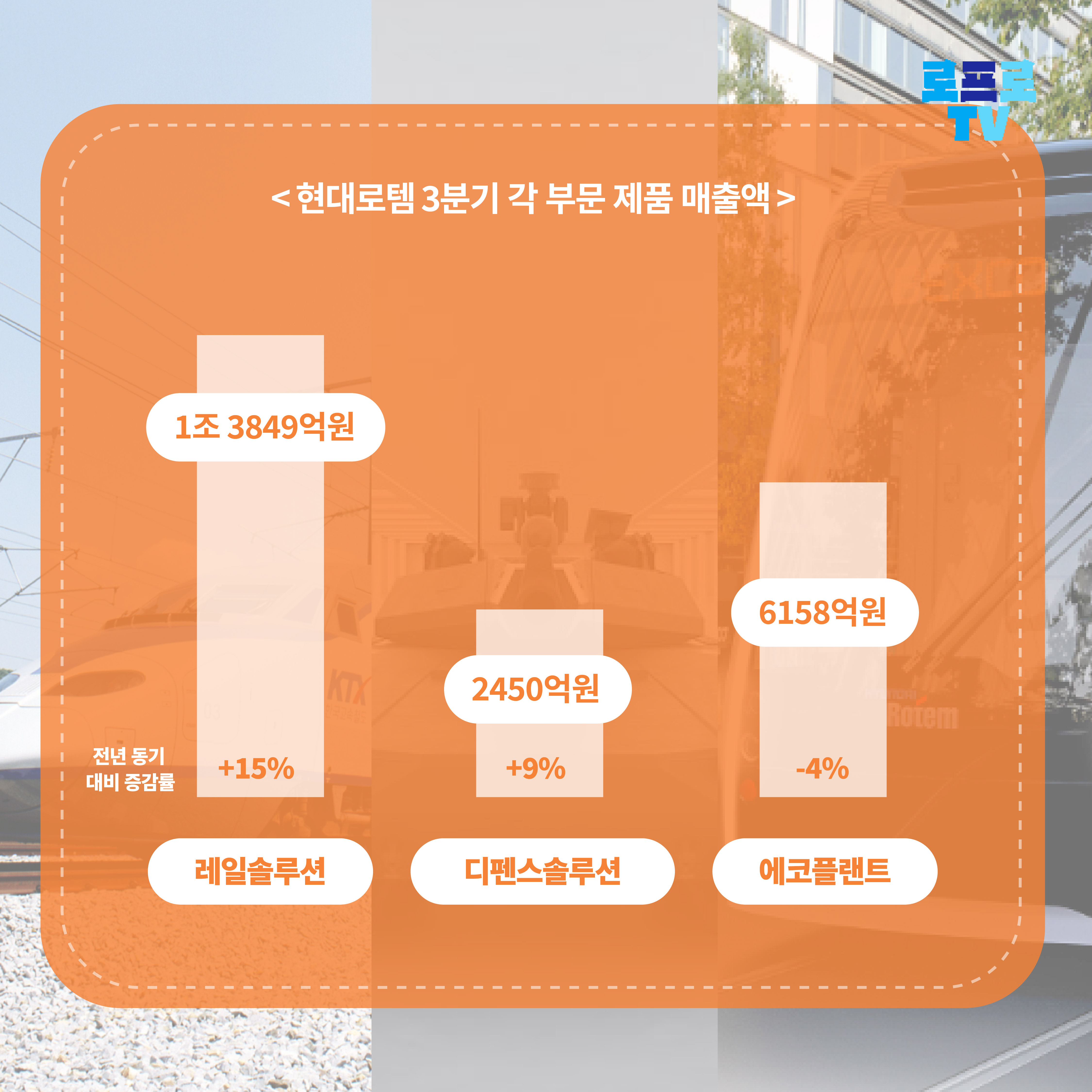 올 3분기 현대로템 사업부별로는 레일(철도) 부문 매출이 1조 3849억원으로 전년보다 15% 늘었고 에코플랜트 부문 매출도 2450억원으로 9% 증가했습니다. 방산 부문인 디펜스 부문은 6158억 원으로 4% 줄었습니다.