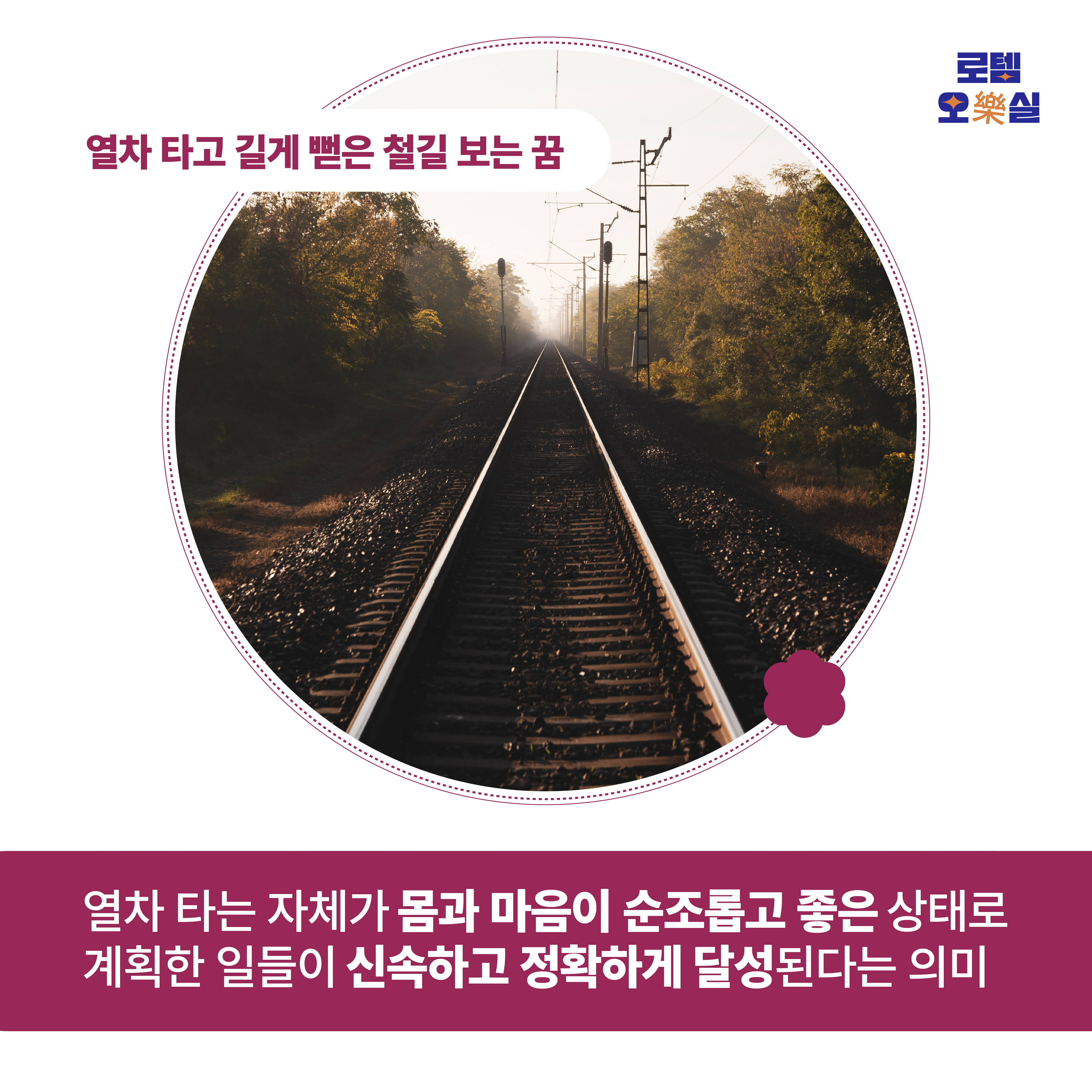 열차 타는 꿈 자체가 몸과 마음이 순조롭고 좋은 상태를 뜻한다고 합니다. 만약 열차를 타고 있고 창 밖으로 길게, 끝도 없이 이어진 철길이 보인다면 더 좋은 꿈인데요. 현재 삶이 안정적이고 평온하다는 의미로, 계획한 일들이 신속하고 정확하게 달성될 것이라고 합니다. 현상황을 유지하며 뒤돌아보지 말고 앞으로 나아가봐요.
