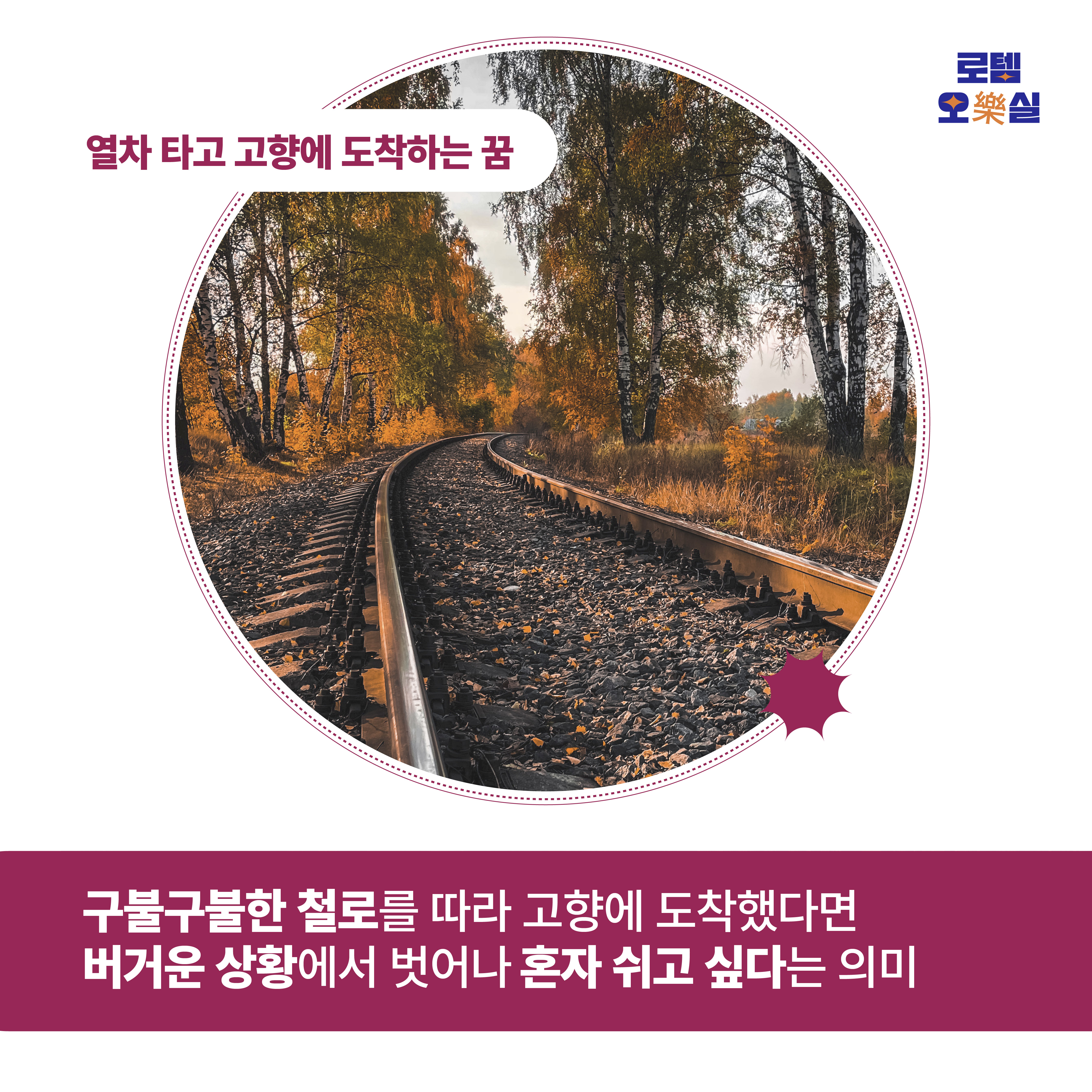 구불구불 이어지는 철로를 타고 고향에 도착하는 꿈을 꾸었다면 현재 심적으로 힘든 상태라고 합니다. 버거운 상황에서 벗어나 혼자 편안하게 쉬고 싶은 마음이 반영된 것인데요. 다만 이 꿈을 꿨다고 해서 많이 걱정하지 않으셔도 됩니다 스스로가 어떤 점이 힘들고 지치는지 알아가는 기회가 될 수 있기 때문입니다. 익숙했던 환경에서 벗어나 가까운 역에서 기차 타고 혼자만의 여행을 떠나는 건 어떨까요. 어떤 일이 나를 괴롭게 하는지 알아가는 시간 가져보세요.
